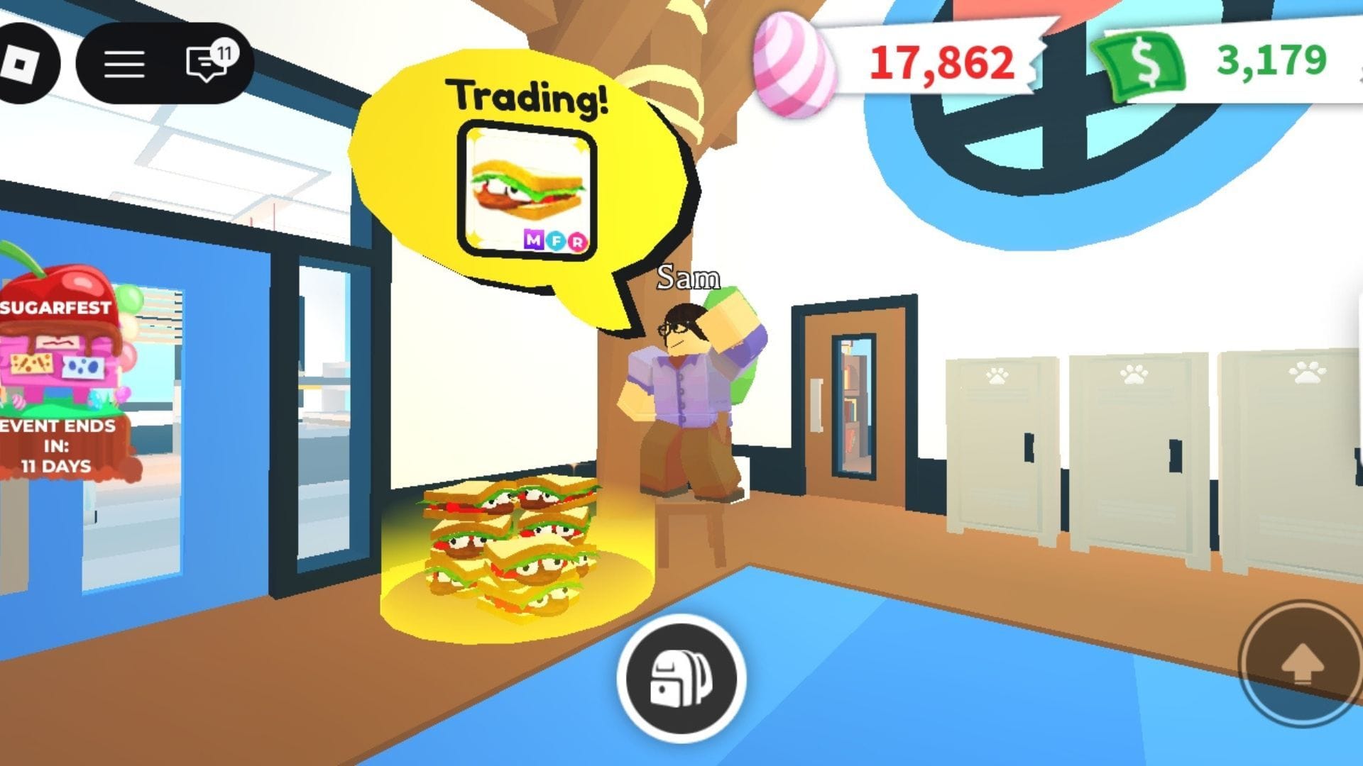 Внутри вы увидите несколько сложенных сэндвичей в компании NPC Sam, который расположен на противоположном конце лобби. Взаимодействуя с этим NPC, вы сможете получить своего MFR Sandwich питомца и насладиться бонусами в 2x Bucks и 2x Aging.
