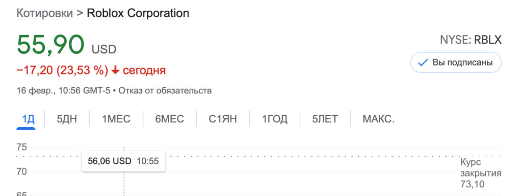 Стоимость акций Roblox пробила исторический минимум с момента выхода на биржу и торгуется на данный момент по $55.90 за штуку. Обрушилась стоимость больше чем на 20%.