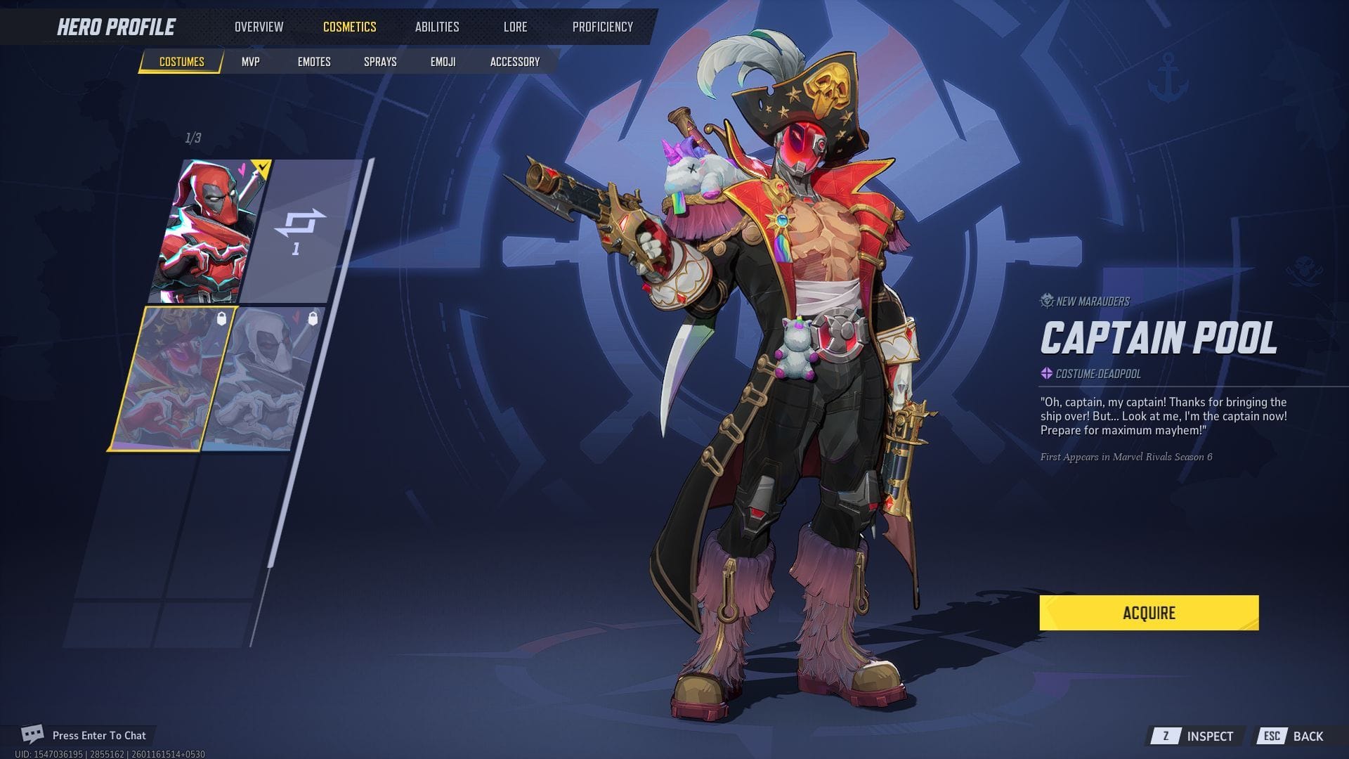 Косметический элемент Captain Pool Deadpool впервые появился в Сезоне 6 Marvel Rivals. Он изображает Мерка с Ртом в капитанской форме и произносит следующую фразу: