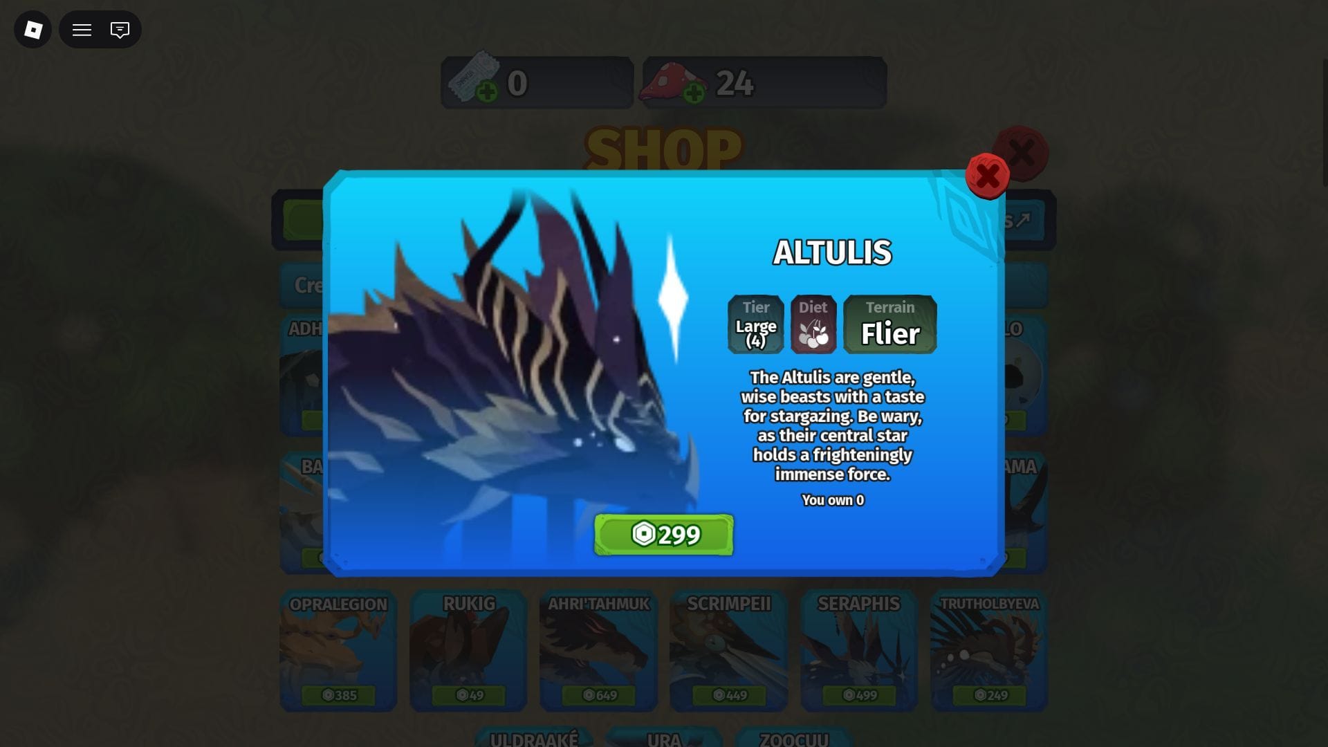 Алтулус можно приобрести в магазине Robux за 299 Robux, что делает его постоянное владение исключительно премиальным. Вы также можете попробовать его в аренду за Шуумы. Стоимость аренды male Алтулуса составляет 4,000 Шуумов, в то время как female версия стоит 40,000 Шуумов. Даже пробные версии все еще довольно дороги, поэтому вам может понадобиться накопить Шуумы перед покупкой существа.
