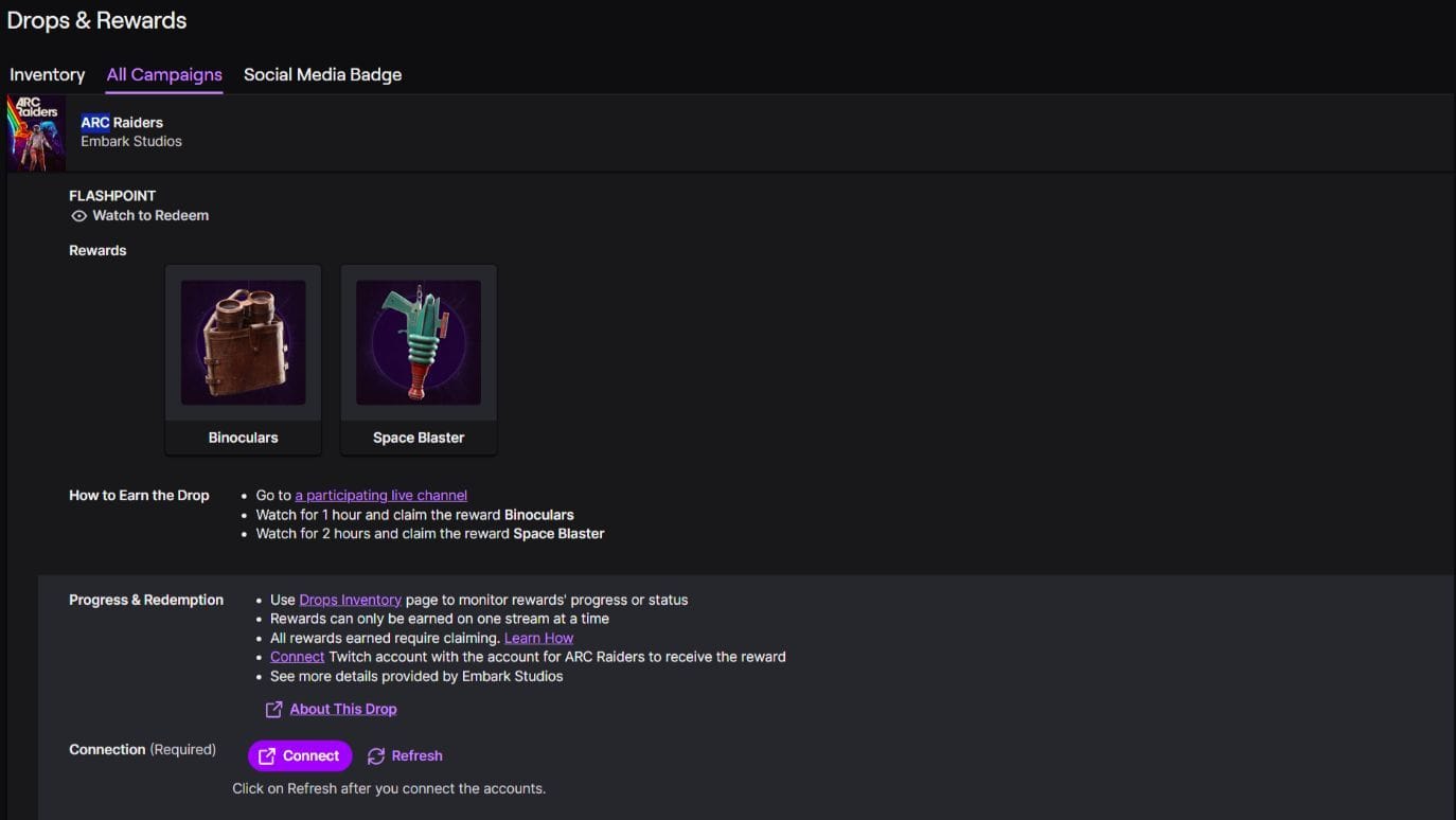 - Смотрите трансляцию в течение необходимого времени: Посетите страницу Twitch ARC Raiders и выберите любую партнерскую трансляцию. Чтобы разблокировать Бинокль, вам нужно смотреть в течение одного часа, а для Космического Бластера требуется два часа. Обратите внимание, что время просмотра суммируется, поэтому вы можете легко достичь этой цели за несколько сессий.