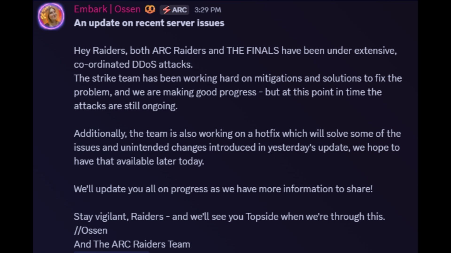 “Привет, Рейдеры, оба проекта — ARC Raiders и THE FINALS — подверглись масштабным, скоординированным DDoS-атакам. Команда работает над мерами по смягчению последствий и решениями для устранения проблемы, и мы добиваемся хорошего прогресса — однако в данный момент атаки все еще продолжаются.”