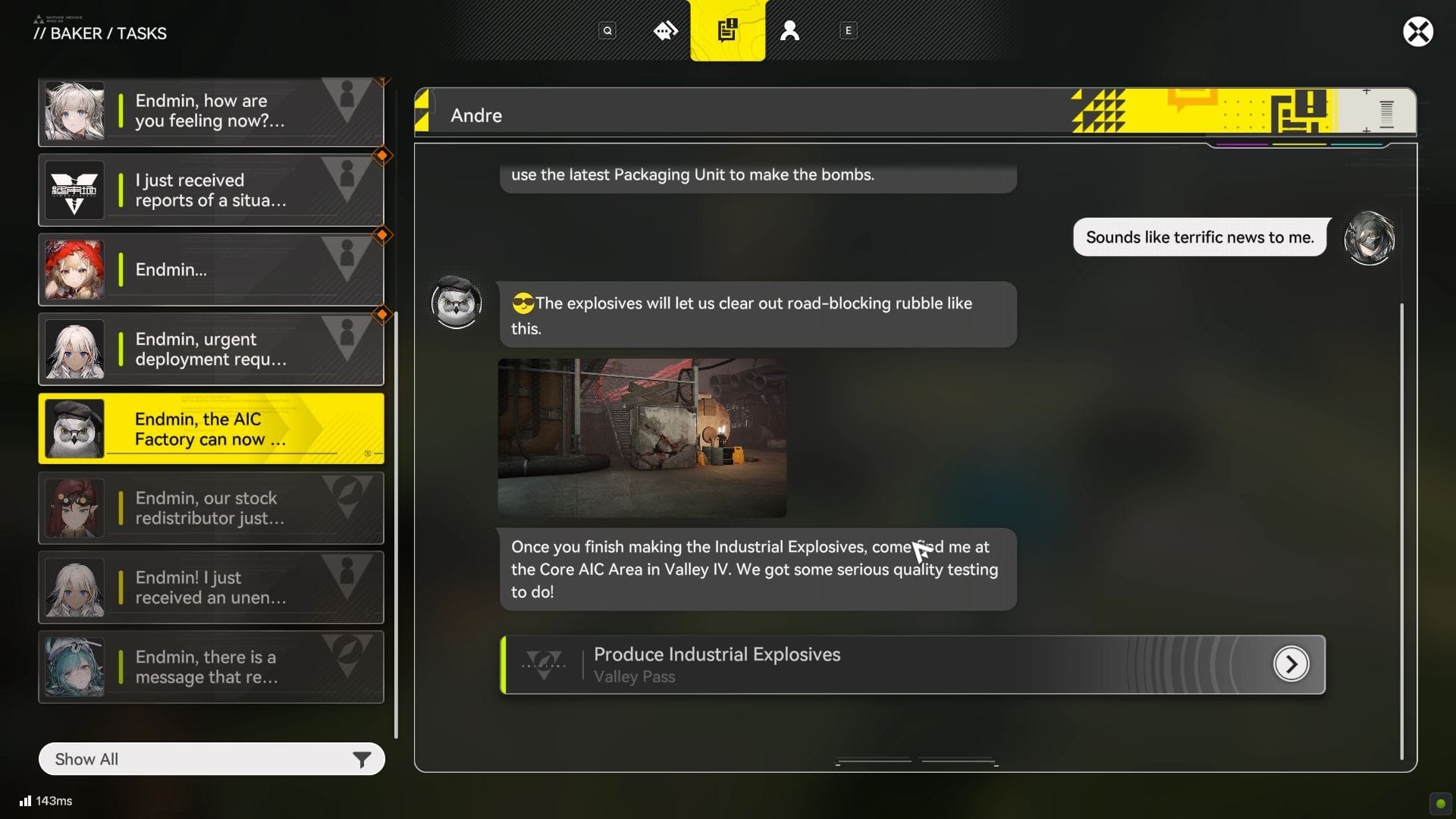 После того как вы разблокируете основной квест в Временном Убежище, вы получите сообщение от Андре. Прочитайте его, чтобы разблокировать квест по производству промышленных взрывчатых веществ в Arknights Endfield.