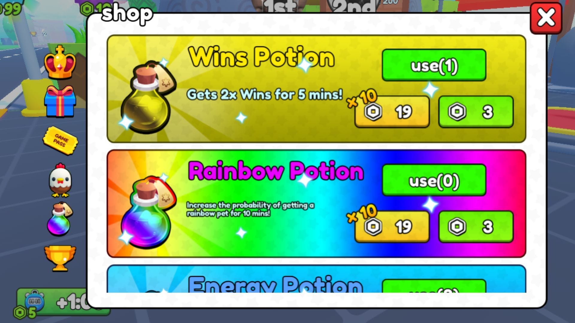 Вы можете приобрести больше зелий за Robux. Особенно стоит отметить, что действия каждого зелья накладываются, поэтому вы можете использовать как Радужное, так и Золотое зелье для увеличения шансов на получение ярких питомцев.