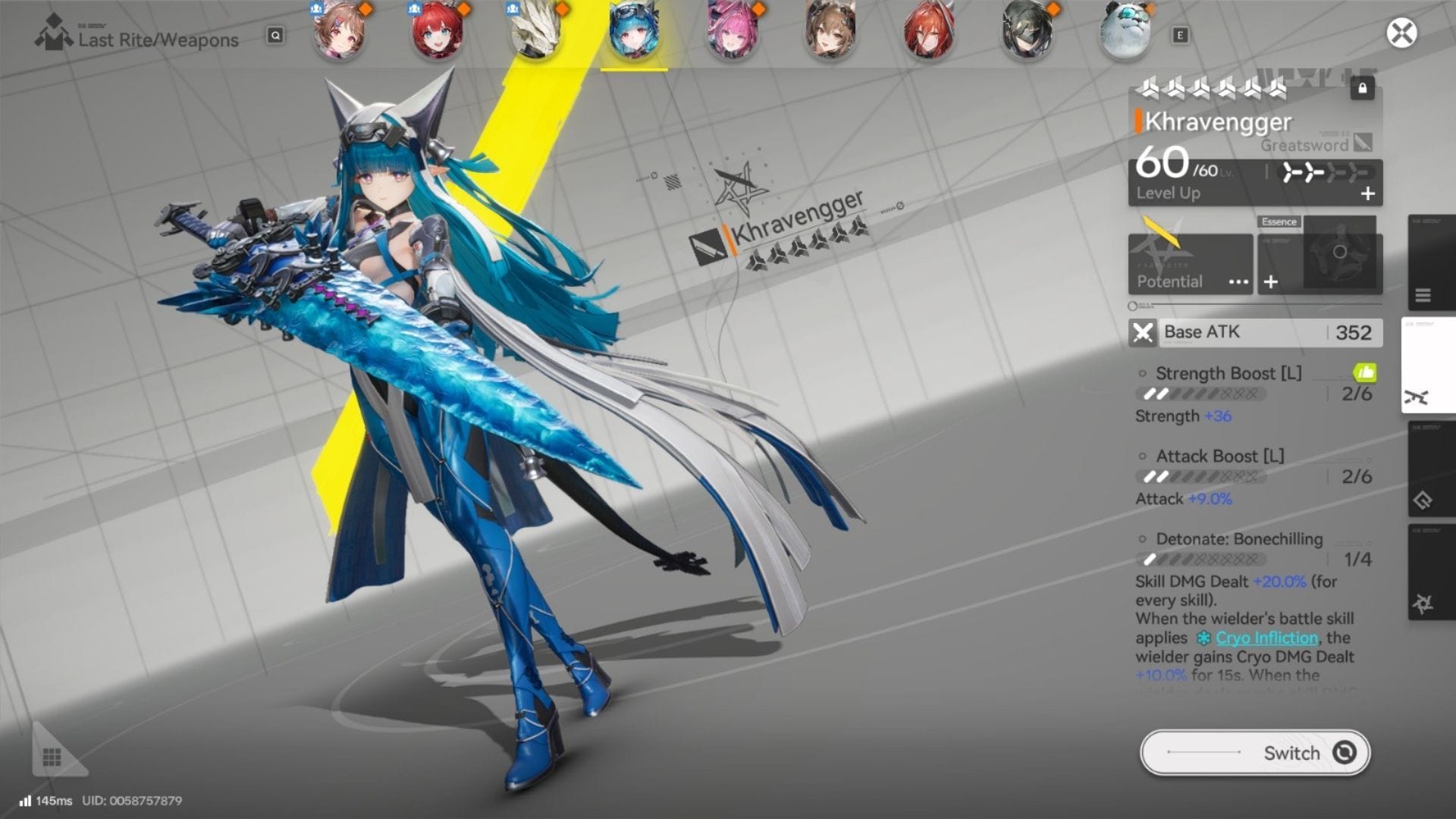 Эти два орудия, возможно, являются наилучшими для Last Rite. Как уже упоминалось, Khravengger — это её фирменное шестизвёздное оружие, и его лучше всего использовать. Оно увеличивает её силу, атаку и также Cryo-урон, что критически важно для её битв. Khravengger увеличивает весь урон на 20%.