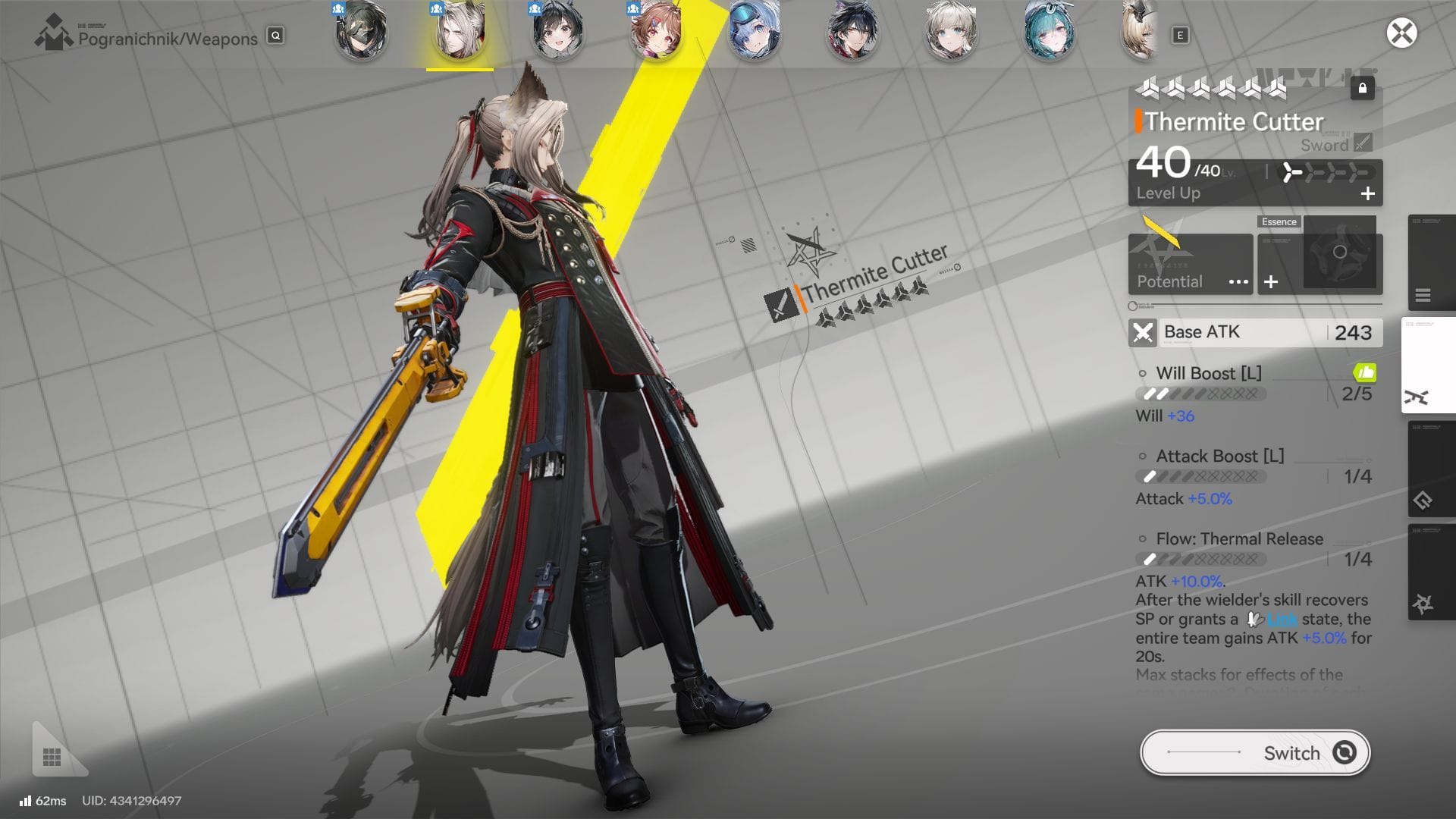 Вторым по величине оружием для него является меч Thermite Cutter, который можно получить бесплатно в ящике для охоты на головы New Horizons. Когда владелец использует свои навыки для восстановления SP или получения состояния Link, вся команда получает прирост атаки. Этот эффект может накапливаться до двух раз.