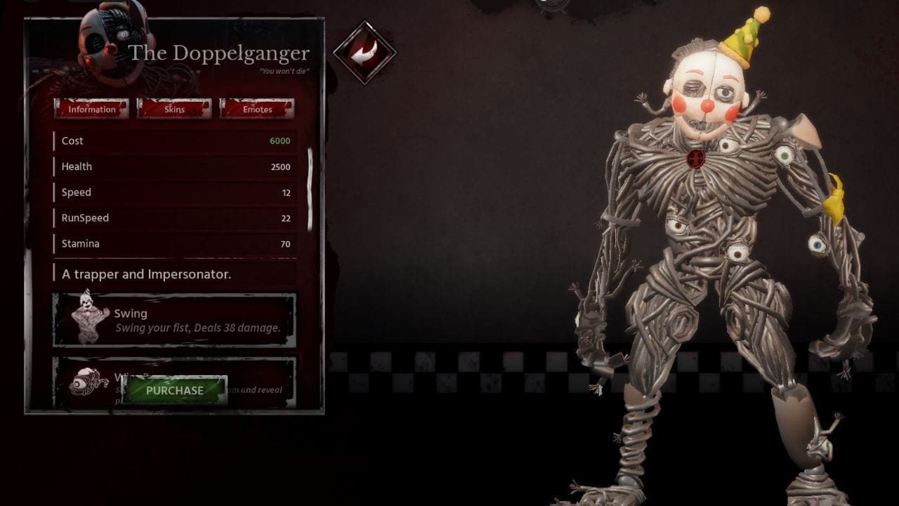По сравнению с другими аниматрониками, Doppelganger на текущий момент обладает наибольшим здоровьем, но наименьшей скоростью. Он может отрывать части собственного тела, чтобы создавать миньонов и, что очень важно, имитировать мёртвого Выжившего.