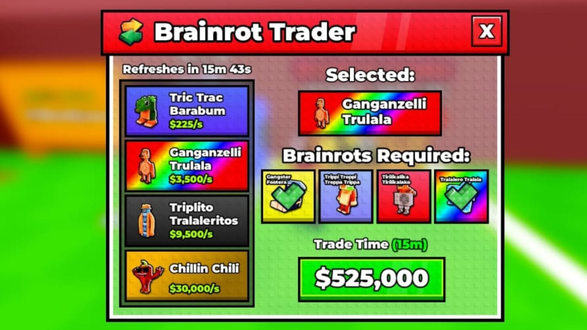 - Соберите все единицы, указанные в разделе “Требуемые Brainrots”, чтобы получить выбранный в меню торговца.