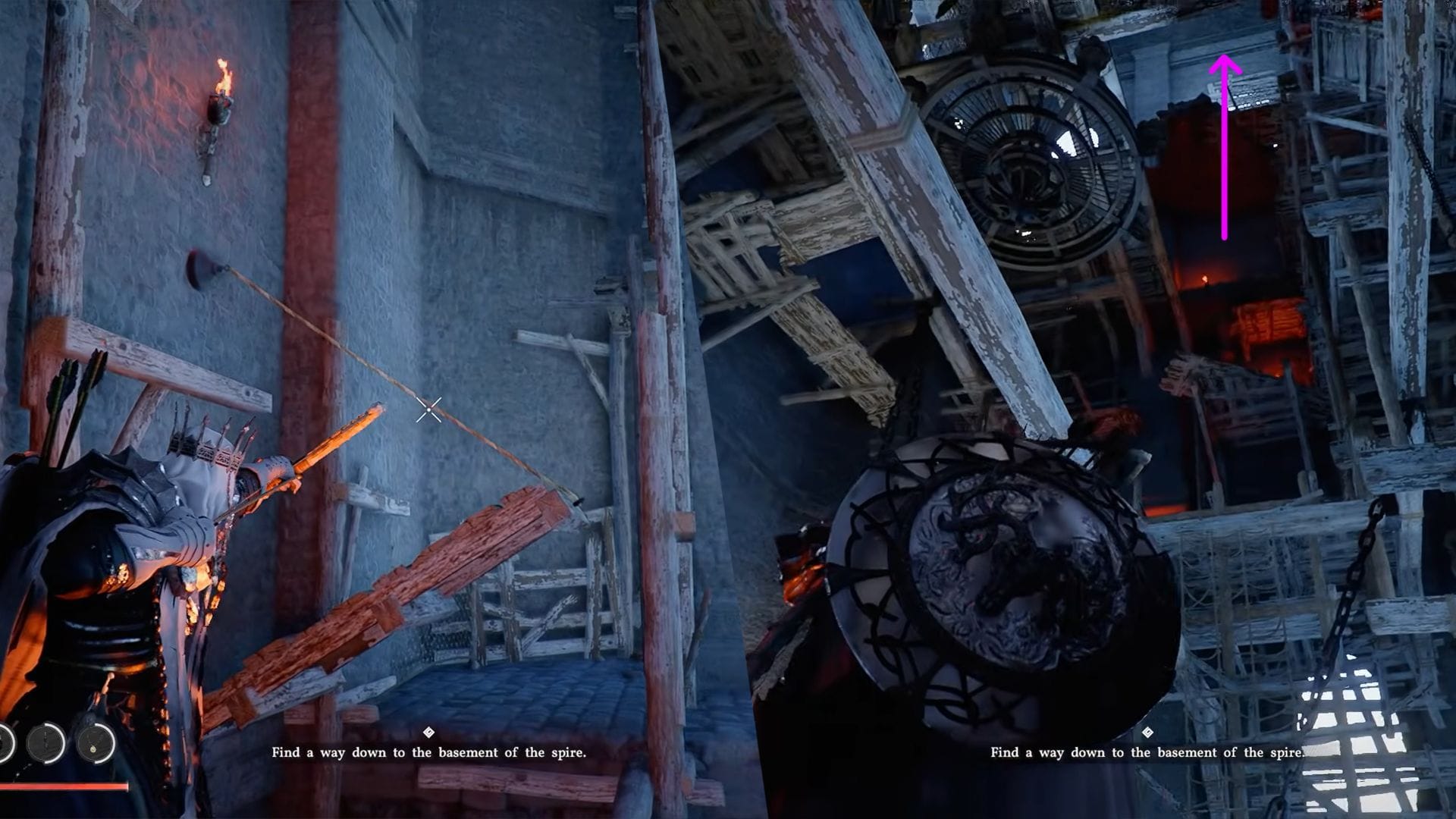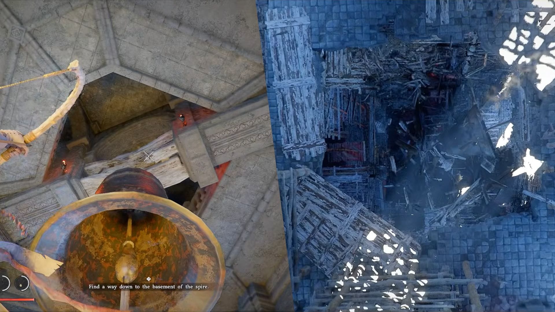 Поднимитесь на вершину шпиля, и вы обнаружите старый колокол, свисающий с потолка. Используйте дальнобойные атаки (стрелы) или Axiom Force, чтобы поразить доски, держащие колокол. Это сломает доски, и колокол упадет на дно, открыв проход в подвал Шпиля Звучащей Истины.
