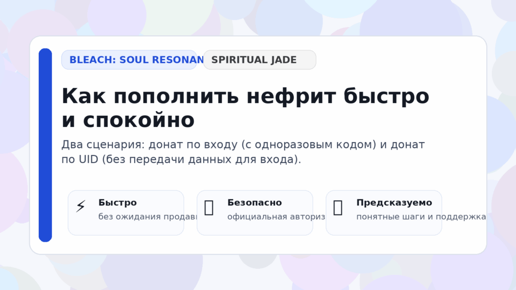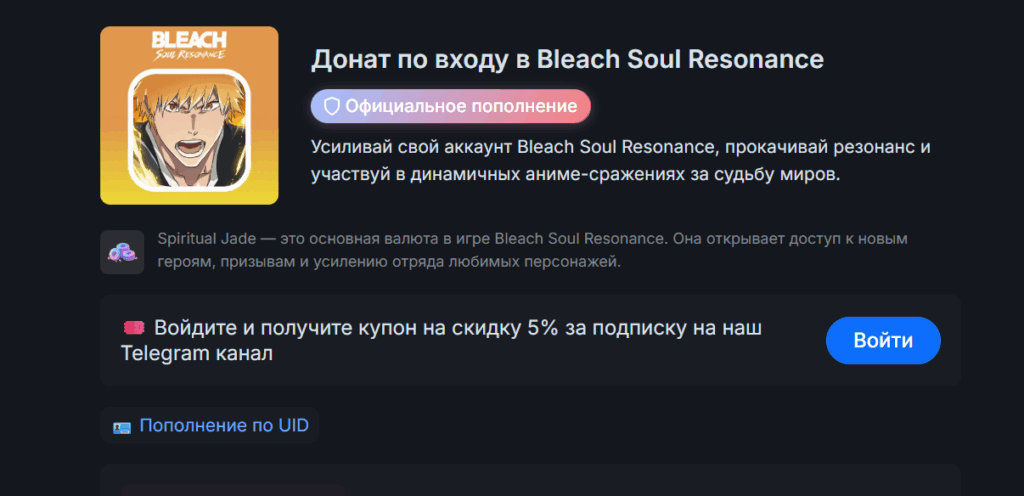Подробный гид по пополнению Spiritual Jade (нефрита) в Bleach: Soul Resonance на Donatov.net: донат по входу с одноразовым кодом и альтернатива по UID без передачи данных для входа. Безопасность, пошаговые инструкции, частые ошибки и FAQ.