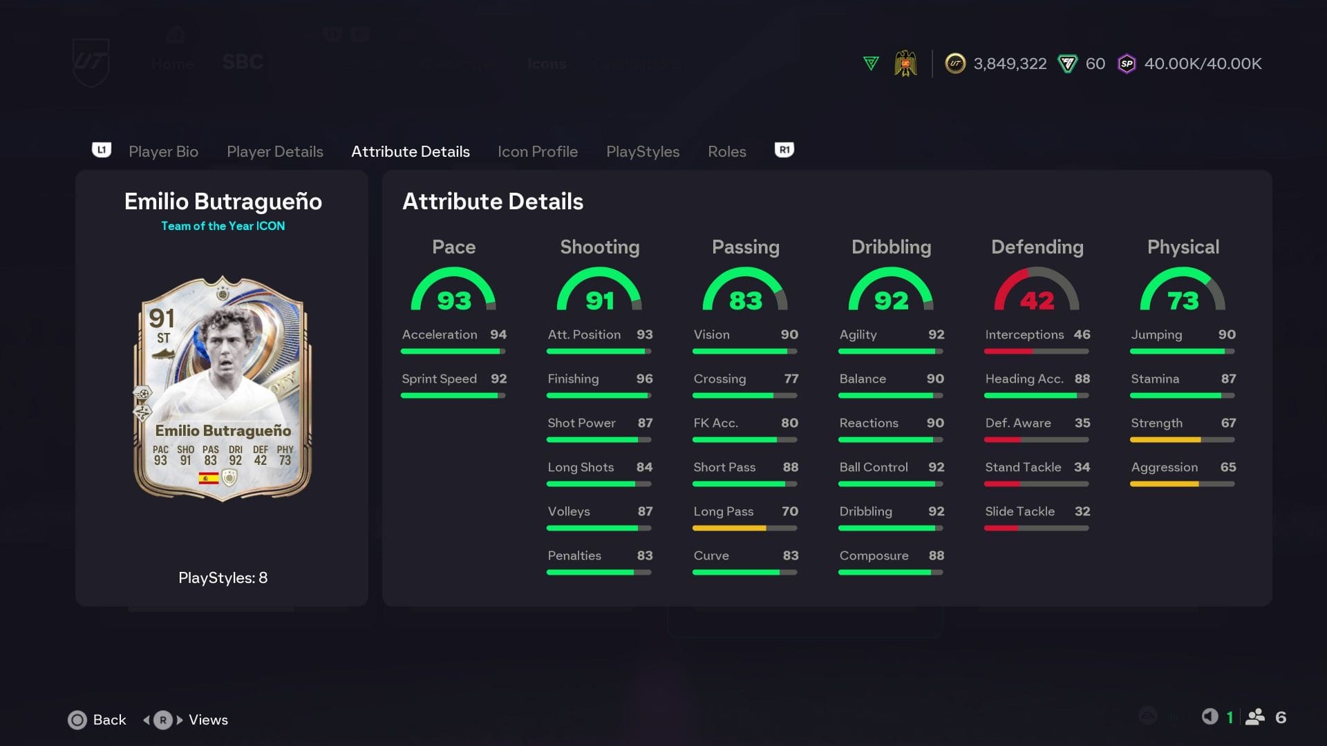 Бывший нападающий Реал Мадрид имеет базовый рейтинг 89 в Ultimate Team. У него уже есть пять звезд слабой ноги, выдающийся дриблинг и отличные способности к удару. Однако его трехзвездочные финты иногда не позволяли ему стать одним из лучших нападающих в игре. Теперь проблема решена с SBC Эмилио Бутрагеньо TOTY Icon для EA FC 26.