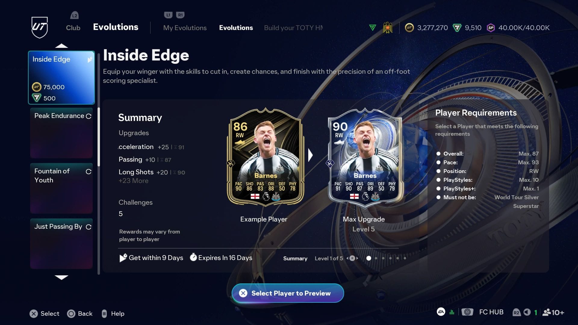 Промо-акция Команда года уже представила некоторые первоклассные EVOS, позволяя игрокам создавать свои собственные предметы ТОТИ Почётных упоминаний. EA FC 26 Inside Edge Evolution не исключение, так как он предлагает игрока с рейтингом 90 после завершения процесса и может быть применён к широкому выбору правых вингеров.
