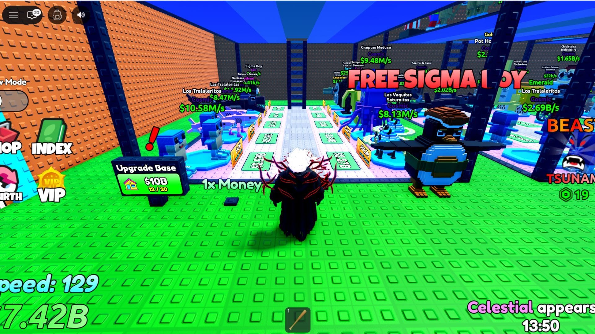 Вы можете улучшить свой показатель скорости в игре с помощью функции Speed Upgrades; это поможет вам избежать волн, собрать единицы или быстрее вернуться на базу. Также доступна функция Carry Upgrades, благодаря которой вы сможете собирать и переносить более одной единицы Brainrot одновременно.