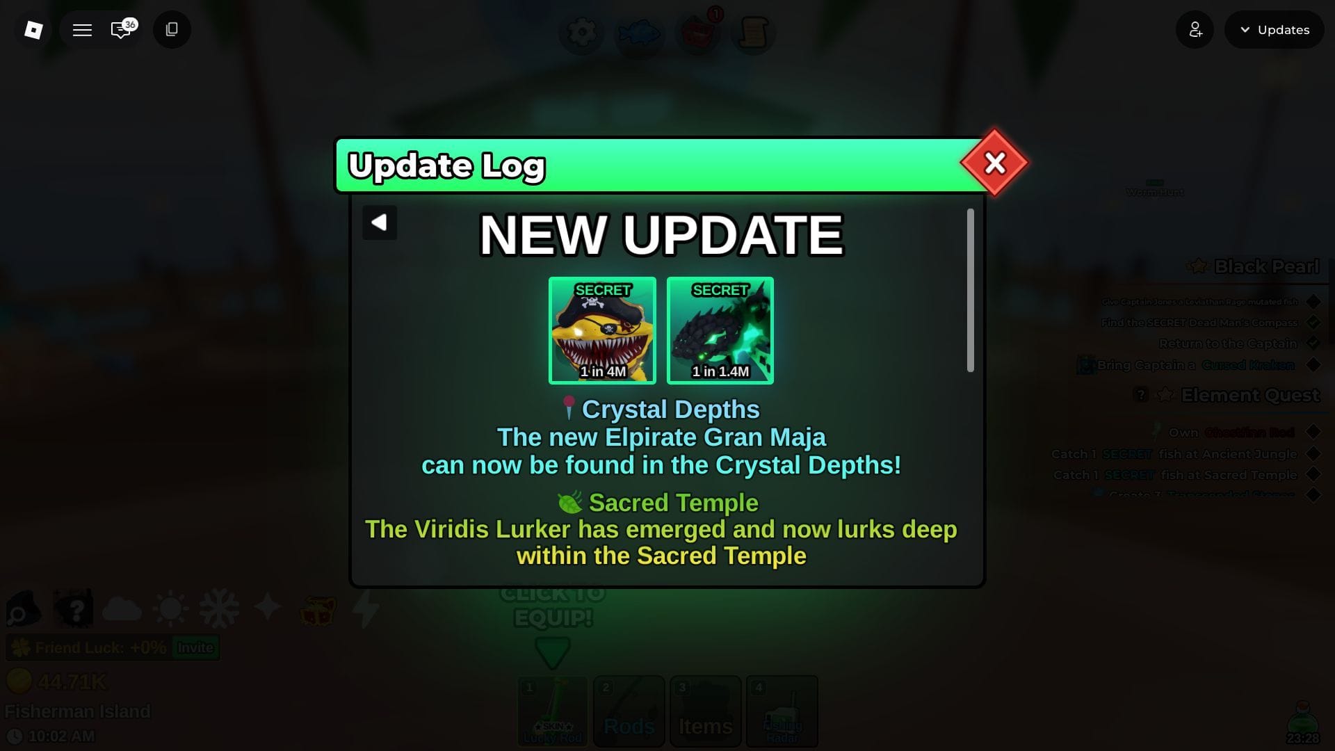 В новом обновлении можно поймать двух новых рыб с редкостью Secret: Elpirate Gran Maja и Viridis Lurker. Эти рыбы были добавлены в уже существующие районы, вместо того чтобы размещаться в новых. Вы можете поймать Elpirate Gran Maja в Crystal Depths, тогда как Viridis Lurker можно поймать в Sacred Temple.