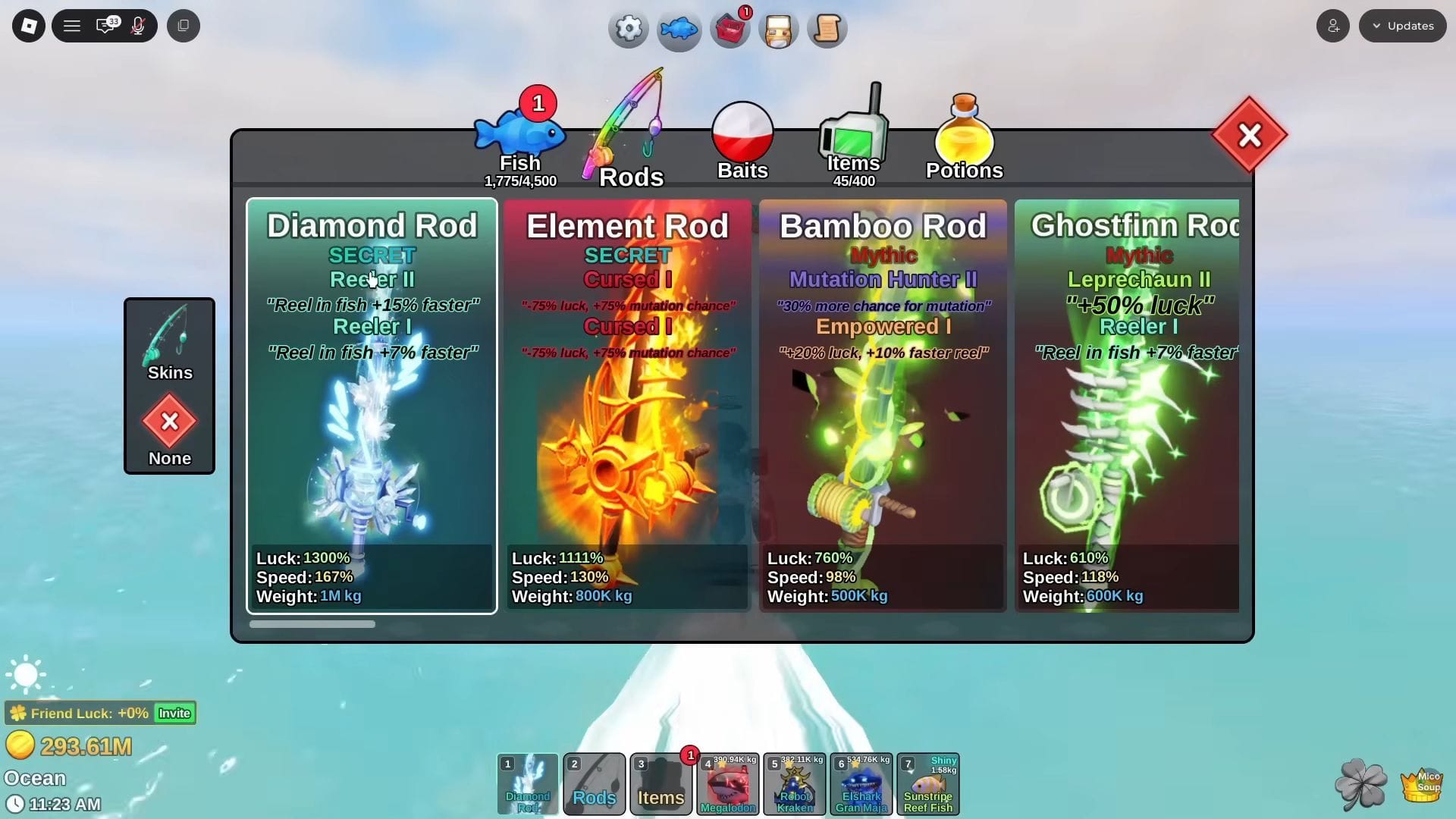 Совместите Алмазную удочку с Зачарованием Искателя Секретов, чтобы увеличить шансы на поимку Секретной рыбы на 140%. Это необходимое зачарование можно получить с помощью Эволюционного Зачарованного Камня. Если возможно, рассмотрите варианты получения зачарований Лепрекон II или Совершенство для этого инструмента.