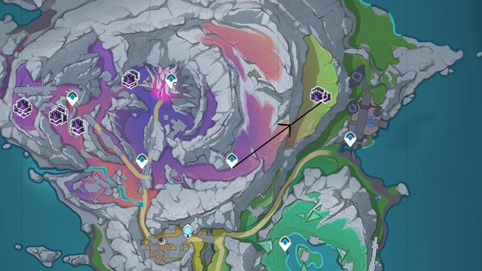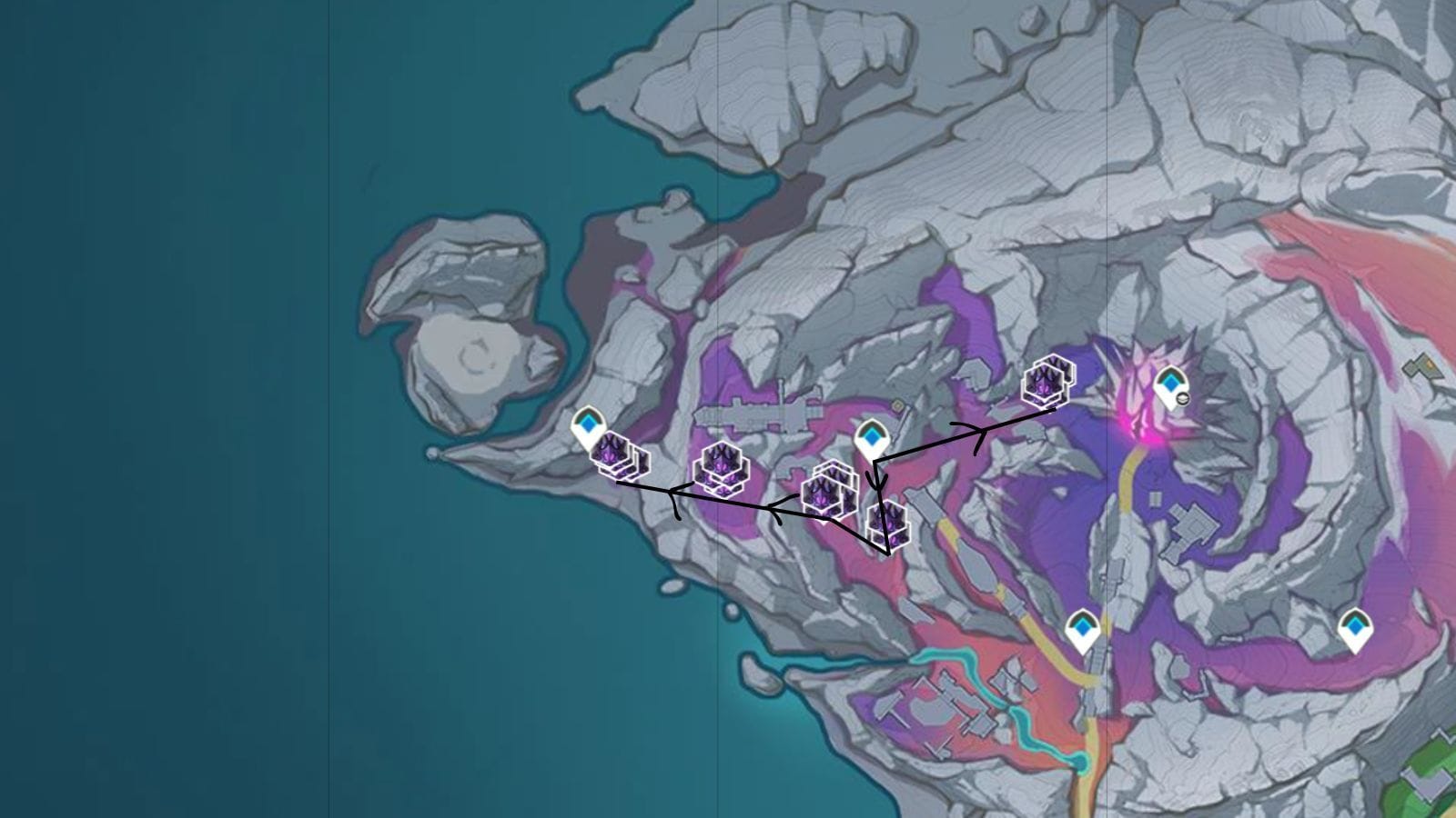 Второй маршрут охватывает местоположения врагов Fisher of Hidden Depths в подрайоне Ashveil Peak, где вы сможете найти 22 врага. Сначала телепортируйтесь к путевому знаку в области Kipumaki Cliff, затем двигайтесь на северо-восток, чтобы найти пятерых врагов.
