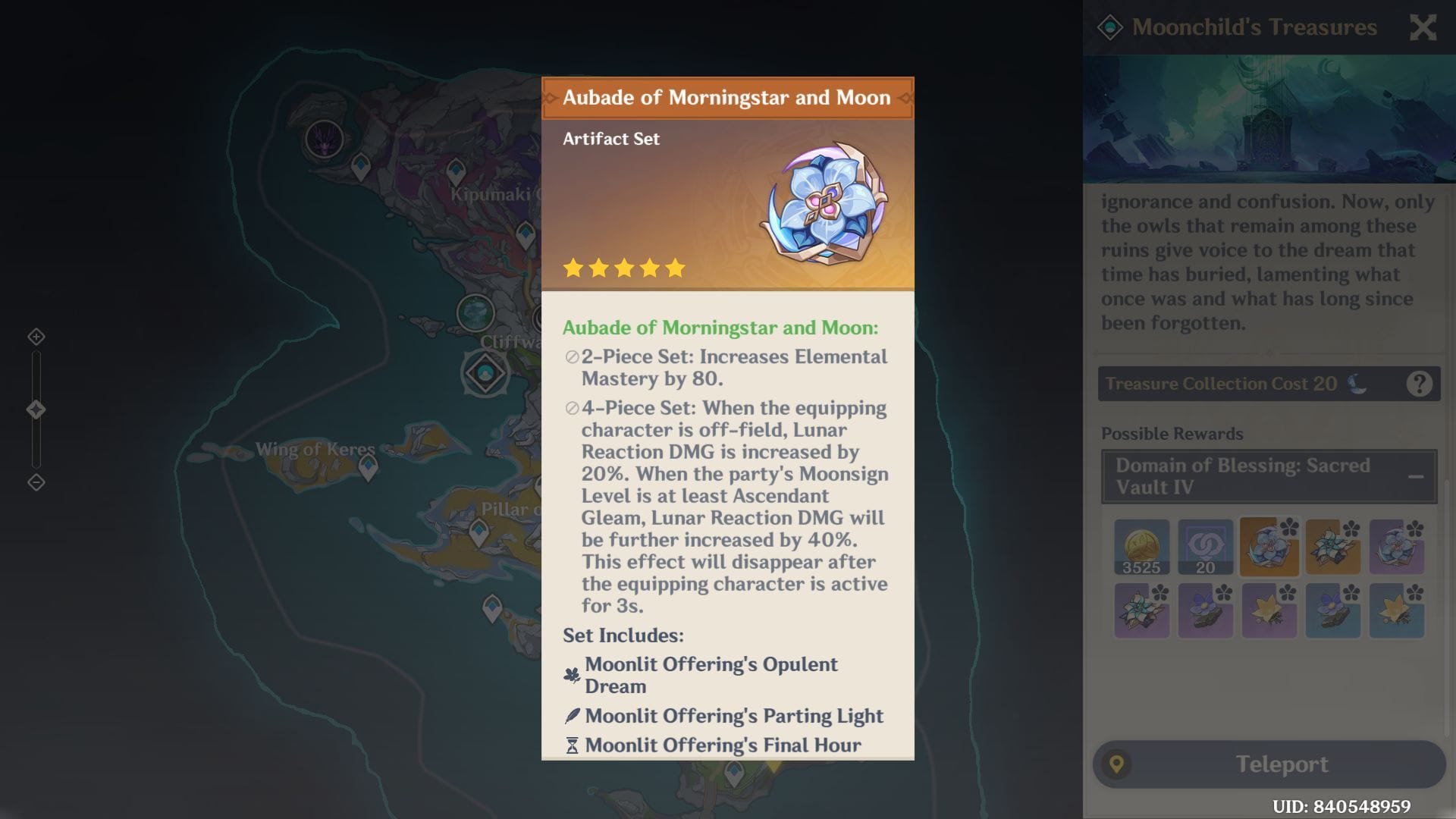 Подобно Инеффе, Линнея может выполнять функции как вторичного урона (суб-ДПС), так и буфера, поэтому Аубад утра и луны обычно будет её лучшим набором. Тем временем Шкура роскошных снов станет её следующим по эффективности набором, так как предоставляет большое количество Защиты и бонус к Гео-урону.