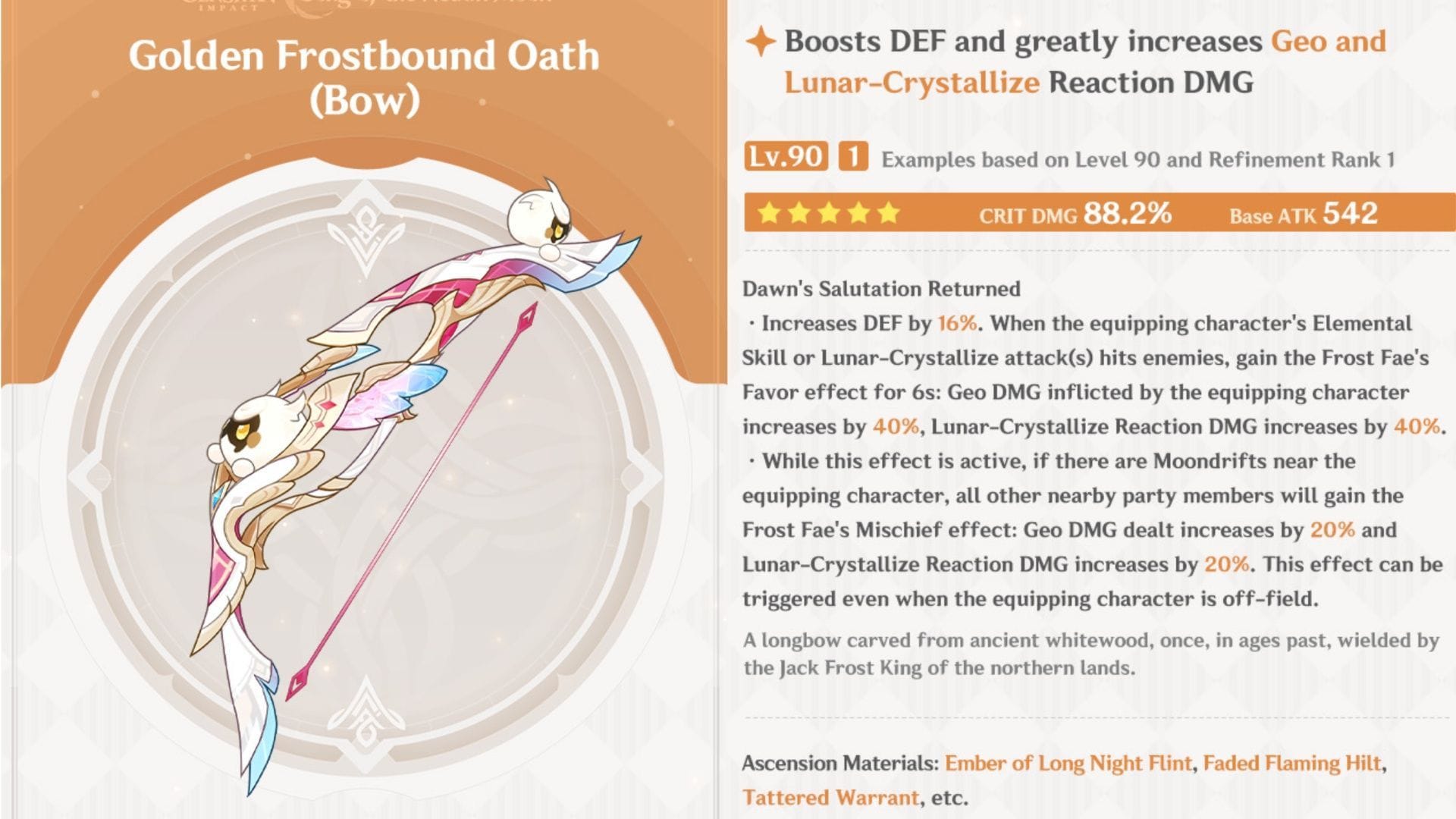 Золотая клятва морозного ока — это сигнатурное оружие Линнеи и лучшее в игре. Оно предоставляет процент Защиты и увеличивает Гео-урон, а также урон от Лунного кристаллизующего эффекта. Кроме того, если рядом находятся Лунные дрифты, этот 5-звёздочный лук также усиливает Гео и Лунный кристаллизующий урон всей команды.