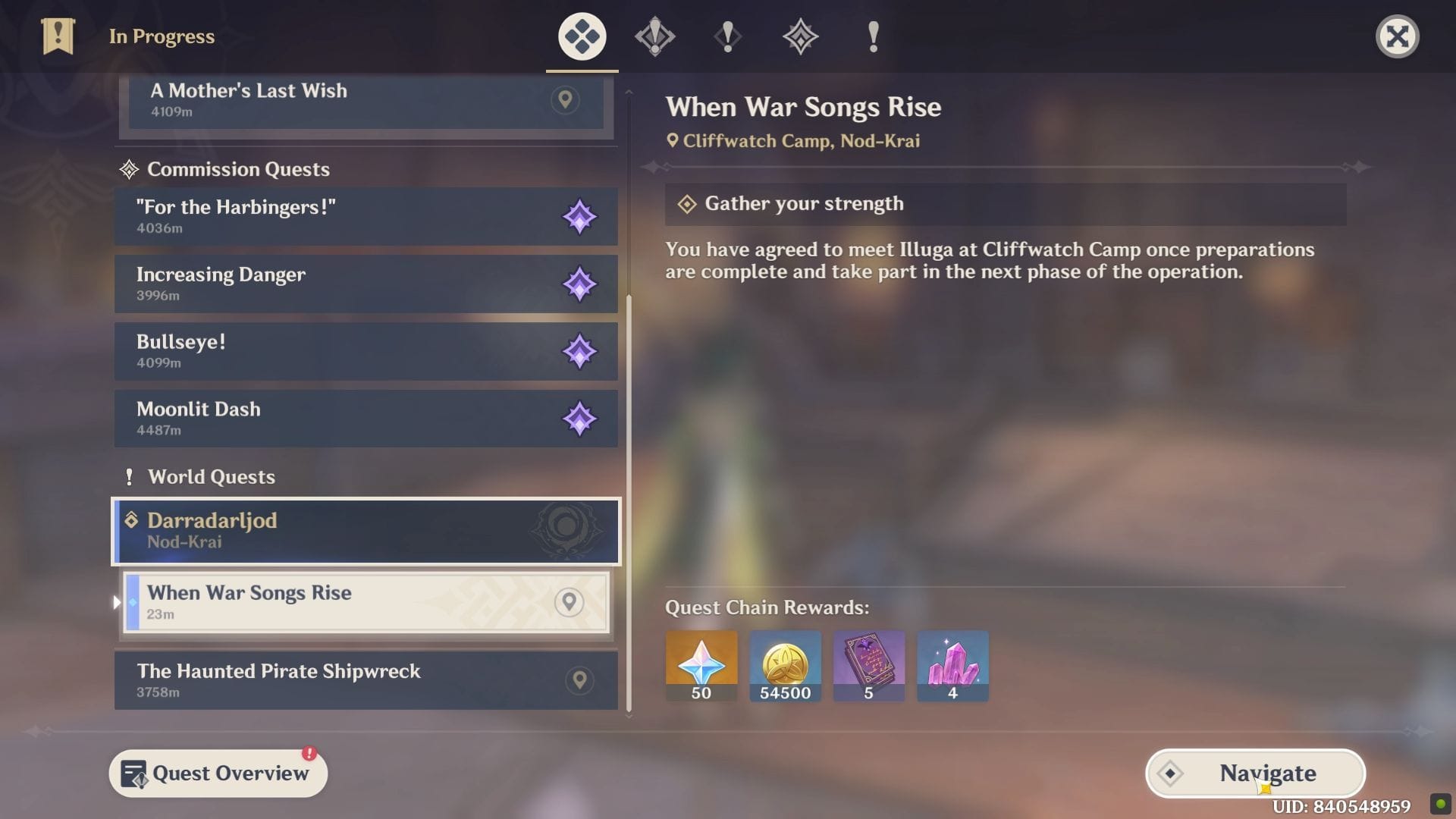 Квест Когда Восходят Военные Песни можно открыть после завершения квестов Волнующие Рябь и Башня Инверсии. Если вы испытываете трудности с началом квеста, возможно, вам также нужно завершить квест Лунный Страж.