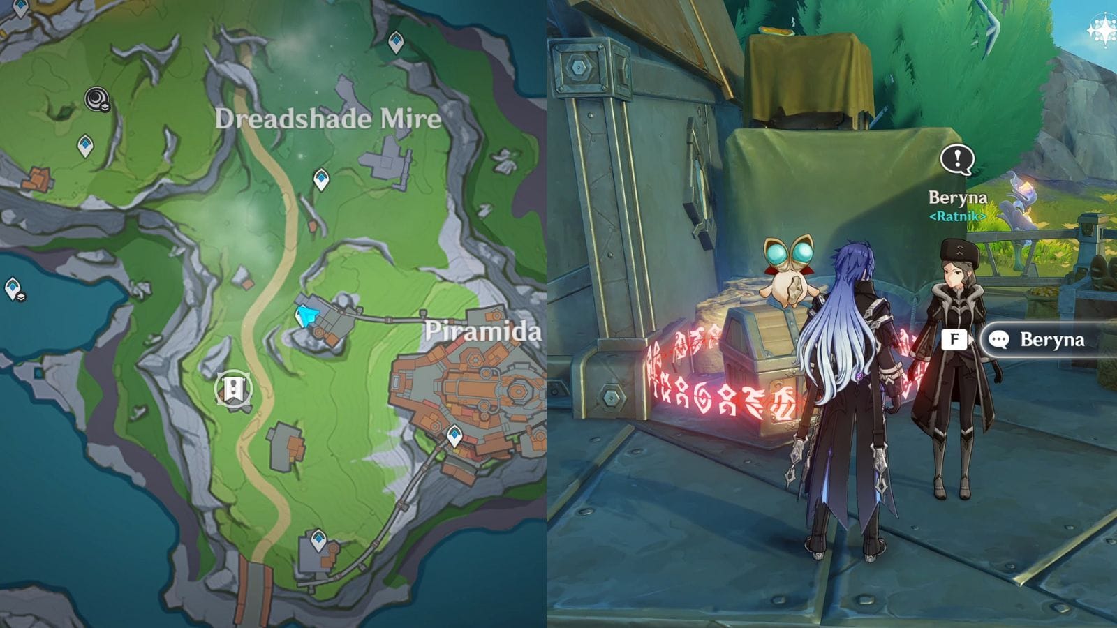 Чтобы получить рецепты Грибной иллюзии и Радости у костра, вам необходимо помочь NPC, Берине. Чтобы найти ее, телепортируйтесь к точке возрождения к северо-западу от точки Пирамида, затем поверните к юго-востоку и направляйтесь к отмеченному на изображении месту.