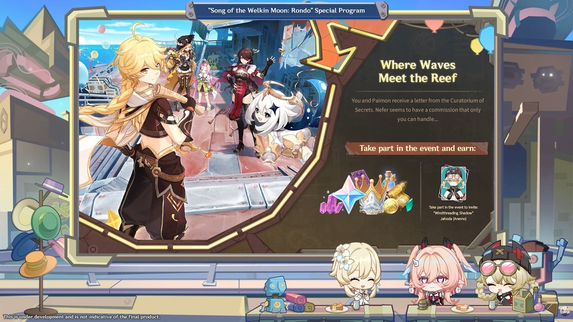 Событие ‘Где волны встречаются с рифом’ является основным в Genshin Impact Luna VI. В нем примут участие несколько знакомых персонажей, таких как Навиа, Бейдоу, Шеврёз и Хлоринда, так что вы сможете их встретить. В рамках события будет три игровых режима, включая симуляцию боев и испытания на скорость.