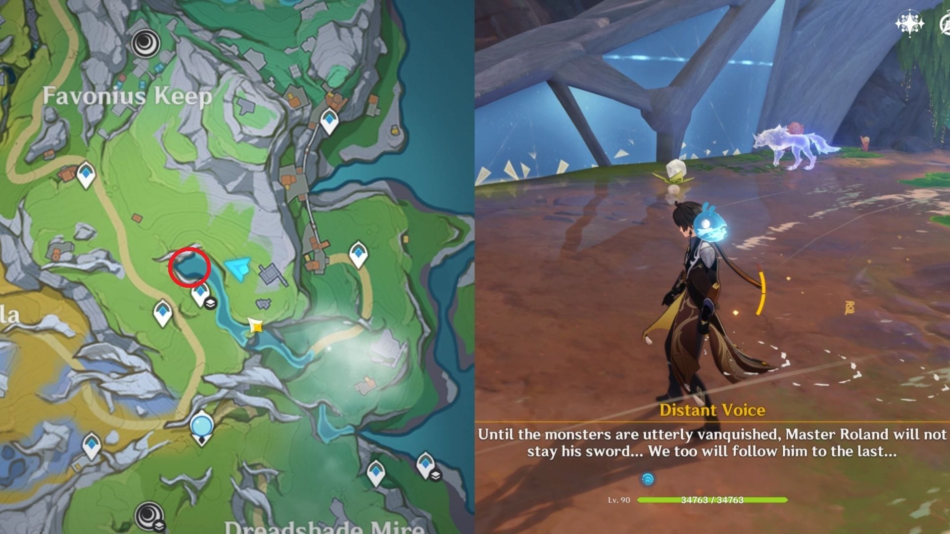 После снятия барьера следуйте за волком, чтобы обнаружить другого волка, сражающегося с Рифтдолгами. Уничтожьте всех монстров и коснитесь сияющей точки на земле, прежде чем следовать за волком к руинам, где вы найдете меч и два сундука.