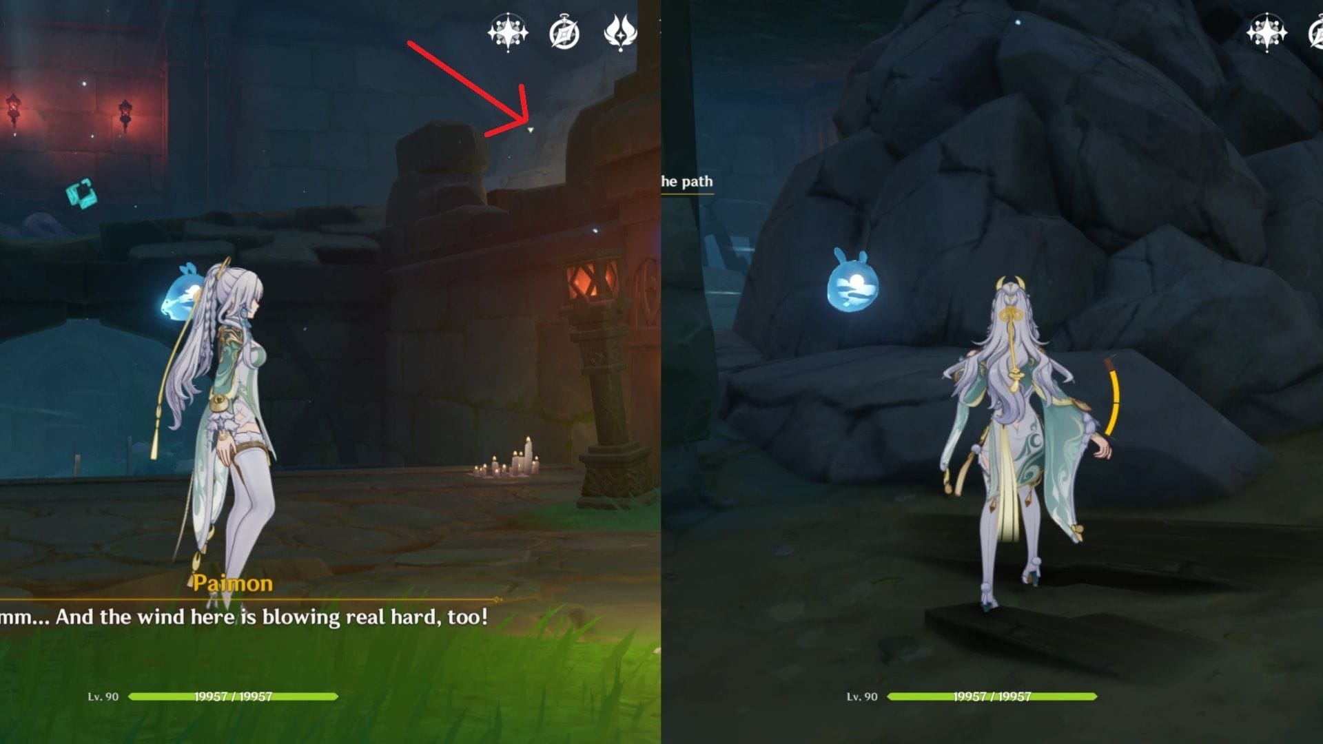 Продолжайте исследование руин и следуйте за источником ветра, чтобы найти еще одни ворота с небольшим пространством вверху. Соберите духи ветра, чтобы создать ветровой поток, и используйте его, чтобы перейти на другую сторону.