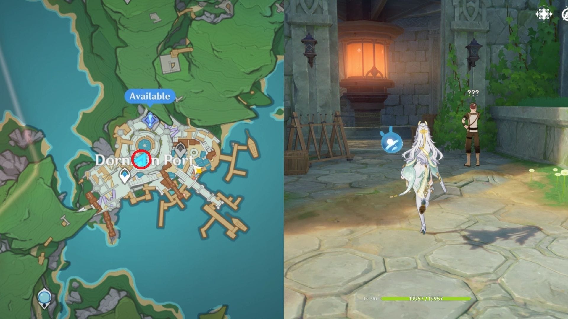 Подойдите к маяку в порту Дорнман и взаимодействуйте с NPC, над головой которого отображается “???”.