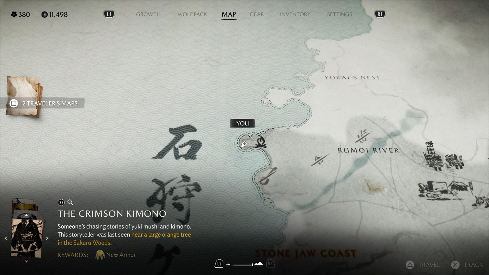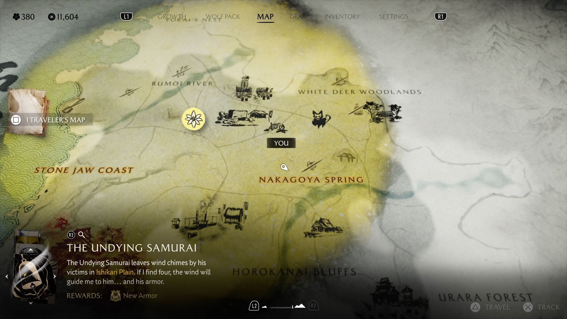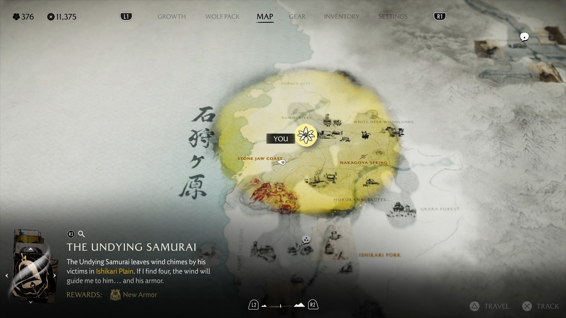 Выберите цветочную метку на карте рядом с Карьером Маскированного Человека (это появится после того, как вы поговорите с Угетсу и услышите историю о Неживом Самурае). Затем смахните вверх на тачпаде, чтобы экипировать веточку с колокольчиками.