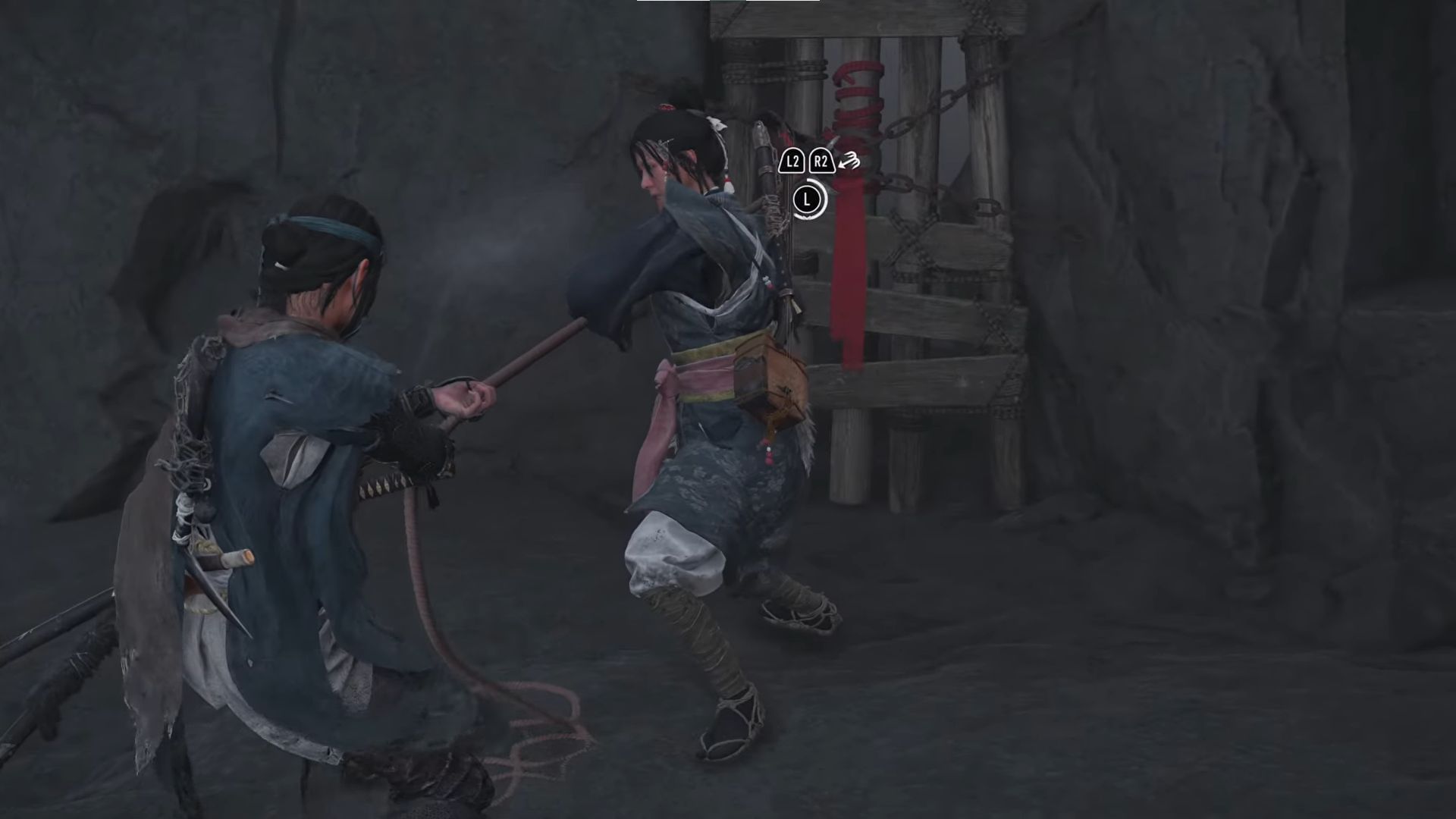 - Он чередует Кусаригаму и Мечи со Щитом каждый раз, когда бросает дымовую шашку. Используйте R3, чтобы отследить его через дым.