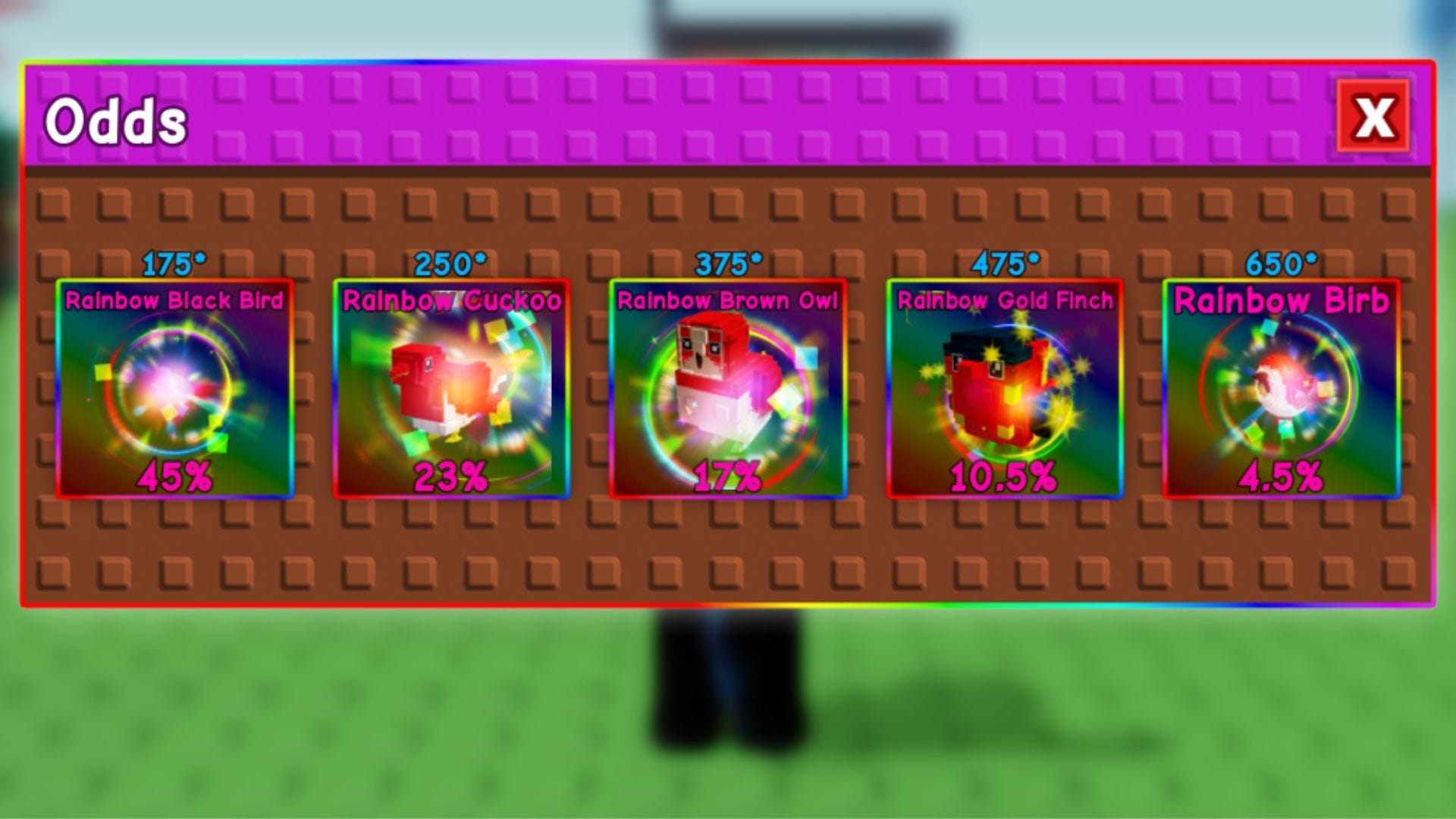 Birb является самым редким питомцем в этом яйце, обладая низким шансом вылупления в 0,10%.