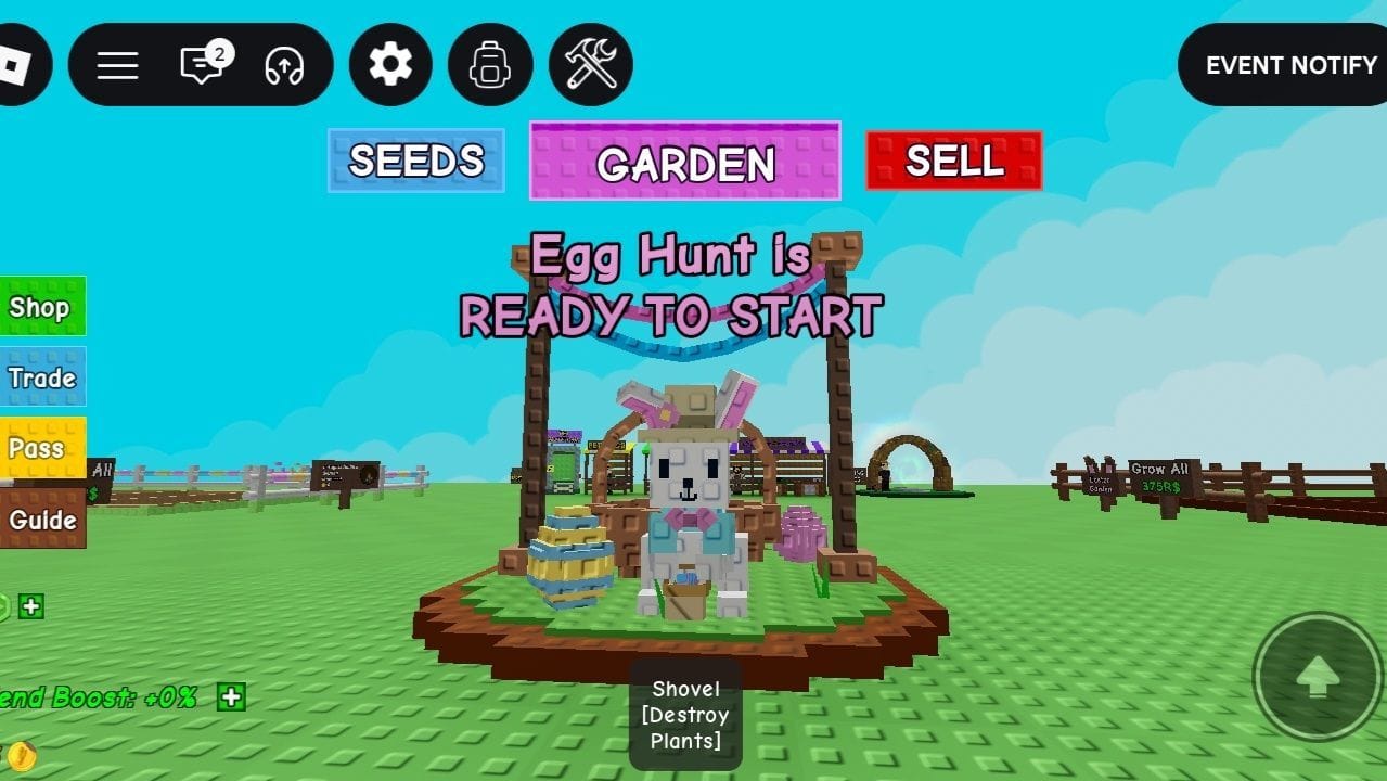 Egg Hunt — это нововведение в виде временного мероприятия или мини-игры в Grow a Garden, которое было представлено в обновлении Easter 2026 4 апреля 2026 года. Чтобы участвовать в нем, вам нужно провести 20 минут в игре, а затем взаимодействовать с NPC Boppy (кролик), расположенным напротив магазина семян события.