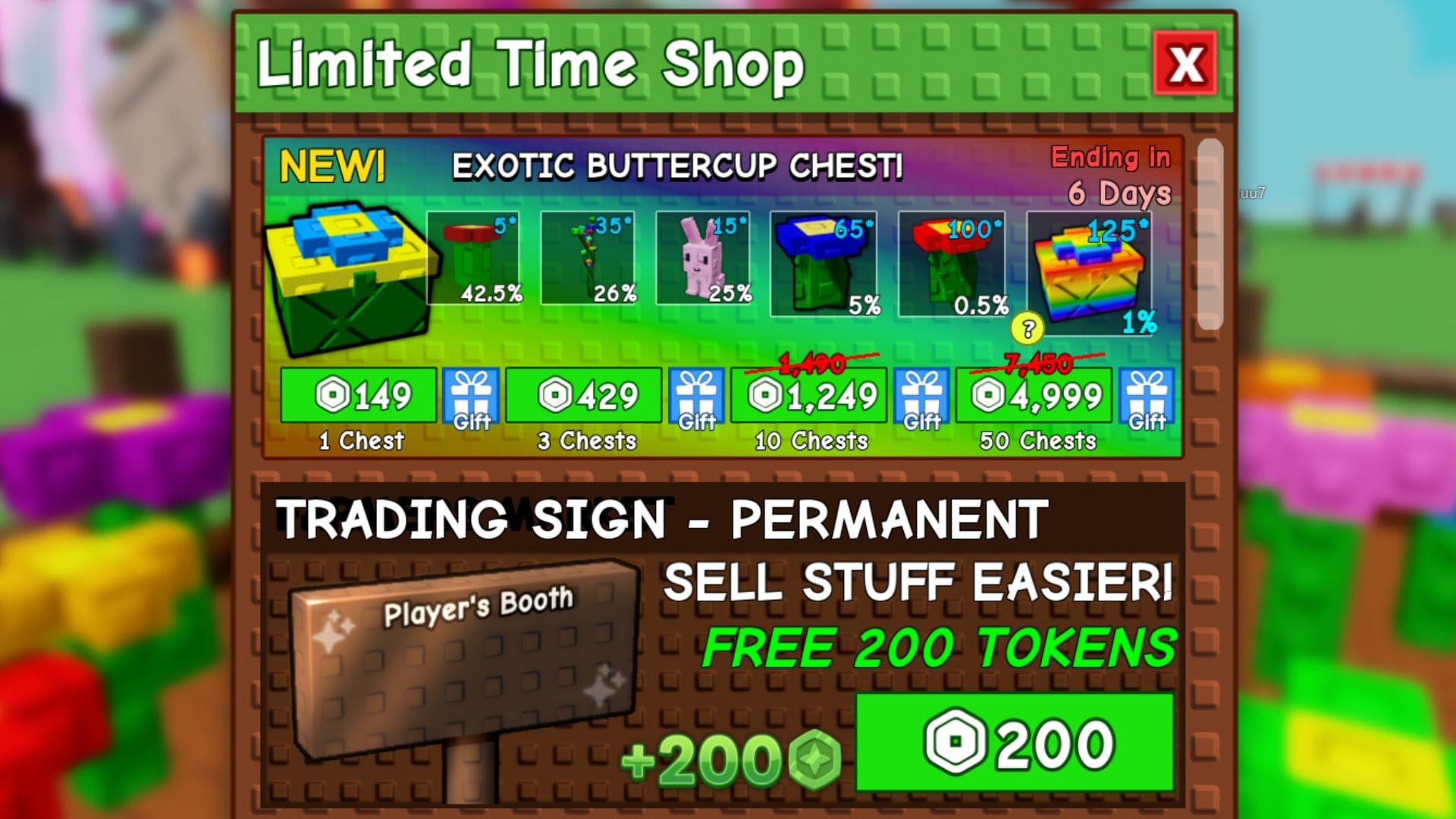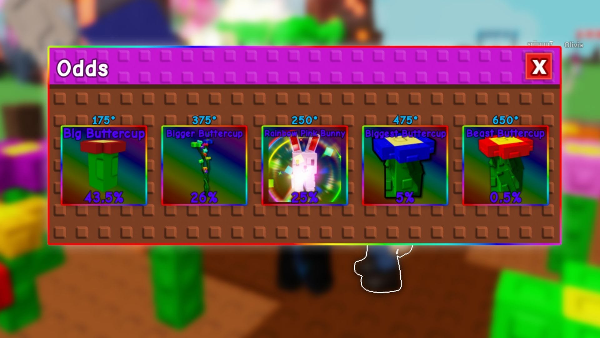 Rainbow Exotic Buttercup Chest особенно примечателен. Этот предмет, эксклюзивный для Exotic Buttercup Chest, содержит радужные варианты Big Buttercup, Bigger Buttercup, Biggest Buttercup, Pink Bunny и Beast Buttercup.