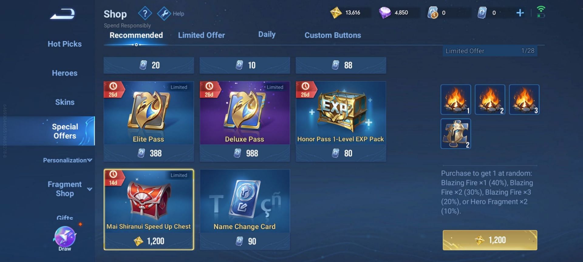 Помимо матчей, игроки Honor of Kings могут приобрести Speed Up Chest в магазине в приложении, чтобы получить Blazing Fire. Перейдите в Shop > Special Offers, чтобы найти сундук. Каждый стоит 1 200 Starstones и содержит четыре предмета, включая Blazing Fire и фрагменты героя.
