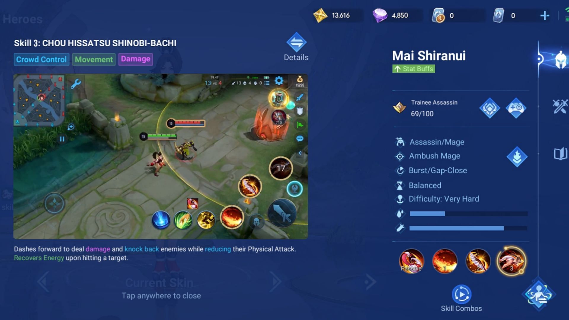 - HISSATSU SHINOBI-BACHI (Пассивное умение): Май усиливает свою базовую атаку каждые 5 секунд, что наносит 100 (+100% магической атаки) урона врагу и отбрасывает его назад, восстанавливая 10 Энергии. Игроки могут использовать движение колеса, чтобы рывком, пока она выполняет базовые атаки или использует умение. Она получает 50% скорости движения, которая постепенно уменьшается в течение 0,5 секунд.
