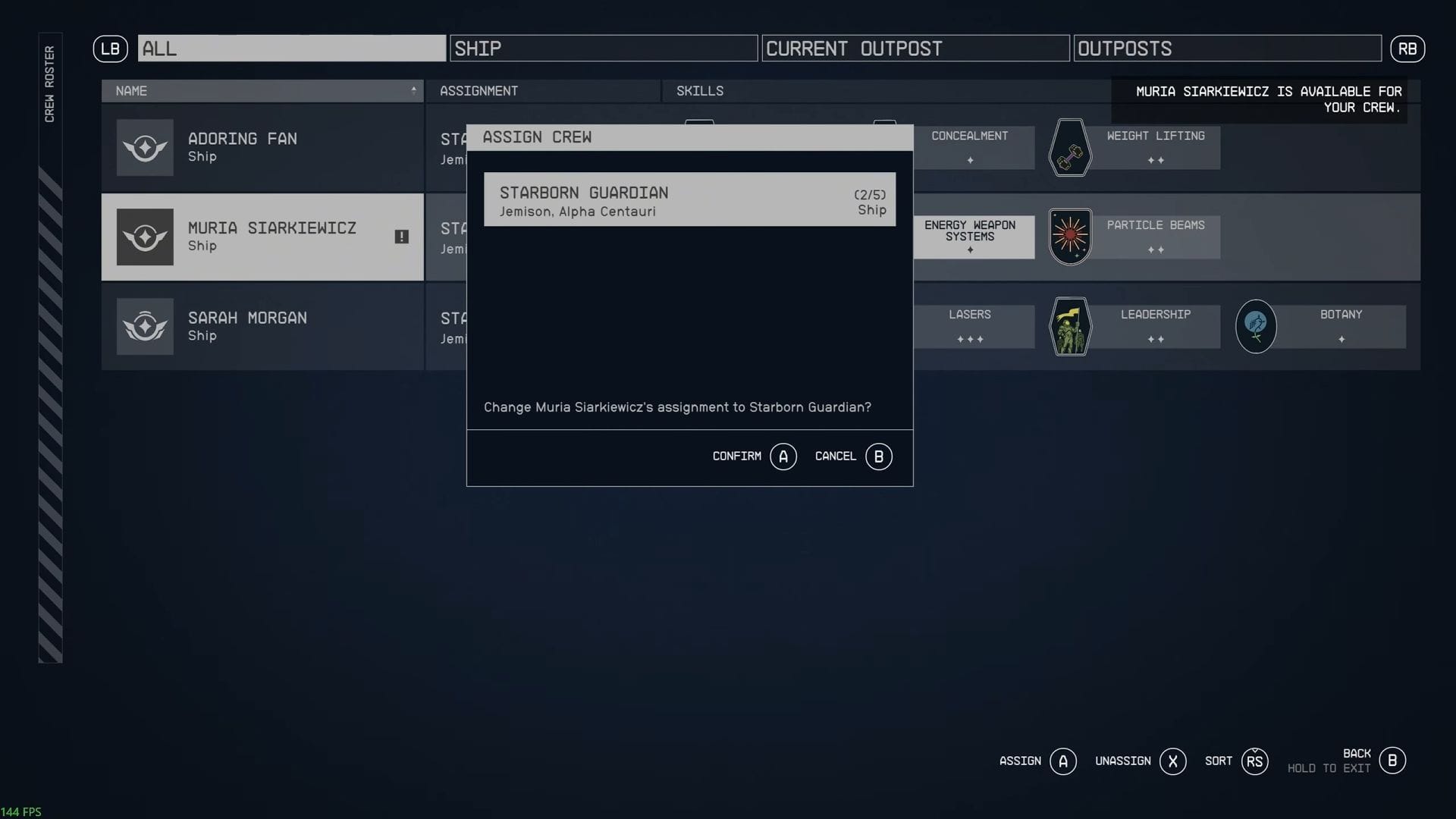 После достижения соглашения, откройте список команды и назначьте Мурию Сиаркиевич на корабль Starborn Guardian. Подтвердите назначение, и она будет на борту с этого момента. Вы сможете найти её на корабле после подтверждения назначения.