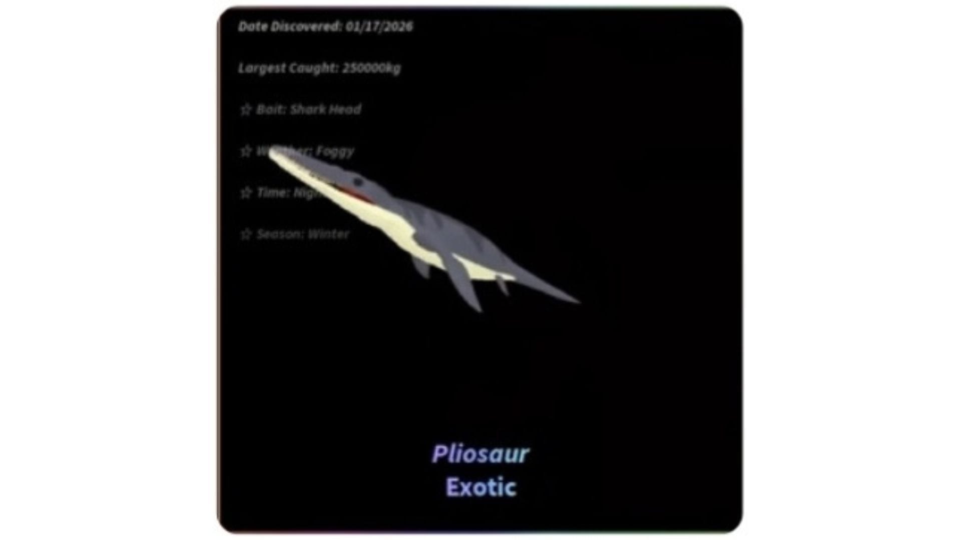 Pliosaur — это экзотическая рыба, впервые представленная в Fisch в обновлении Tidefall 17 января 2026 года. Внешний вид этой рыбы напоминает ящеров из вымершей группы крупных хищных морских рептилий, существовавших в юрском и меловом периодах.