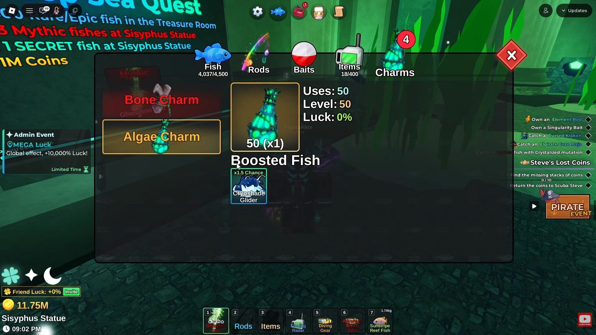 Чармы увеличивают вероятность поймать конкретную секретную рыбу в 1.5 раза.