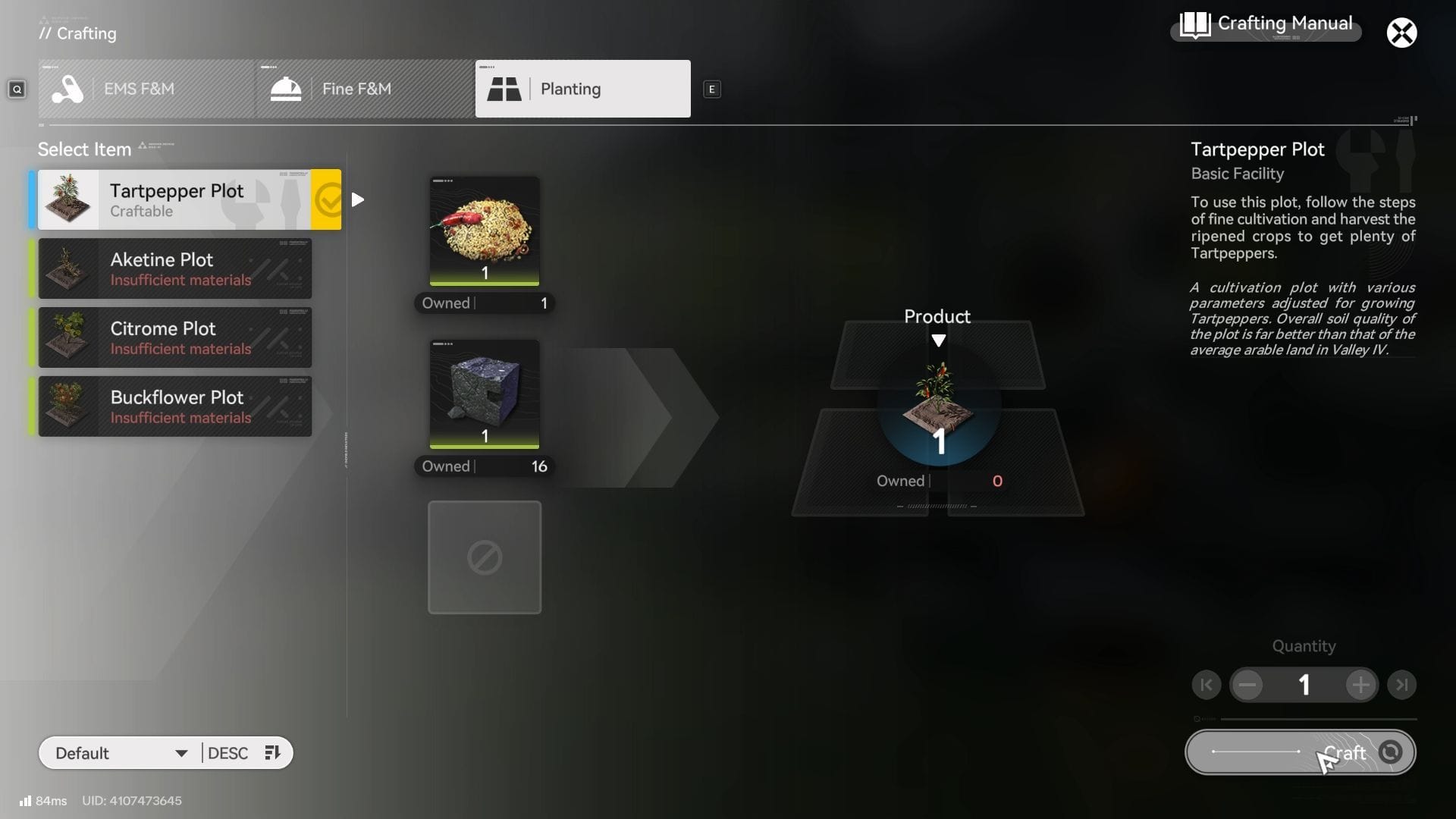 Встретьтесь с Верой у входа на Eco-Farm и используйте Крафтинг для создания участка тартперцев
