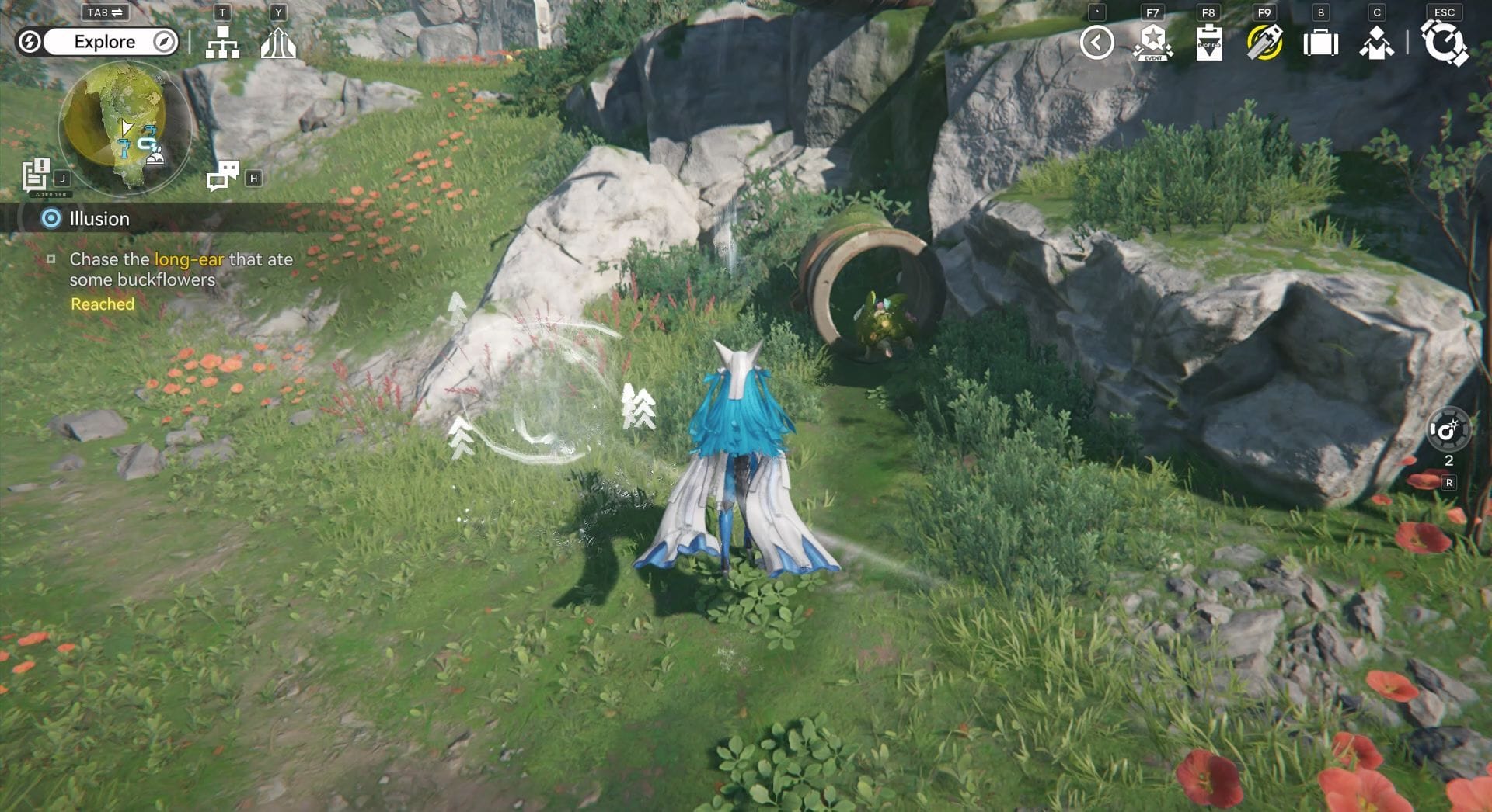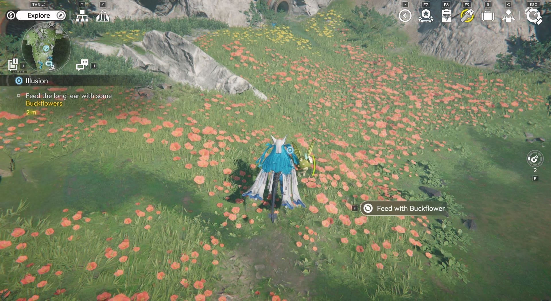 Взаимодействуйте с существом, похожим на кролика, и покормите его Бакфловерами.