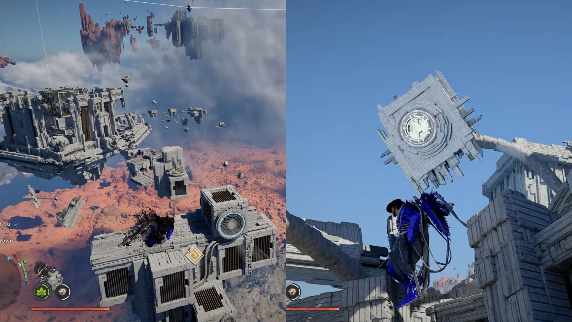 Активируйте Небесный мост в Треугольном Кольце (гнездо воробья) после победы над Crowcaller и направляйтесь к основной структуре, планируя по платформам. Вы можете воспользоваться восходящими потоками от ветровых турбин, но имейте в виду, что первая из них ориентирована в противоположную сторону и может унести вас в другом направлении.