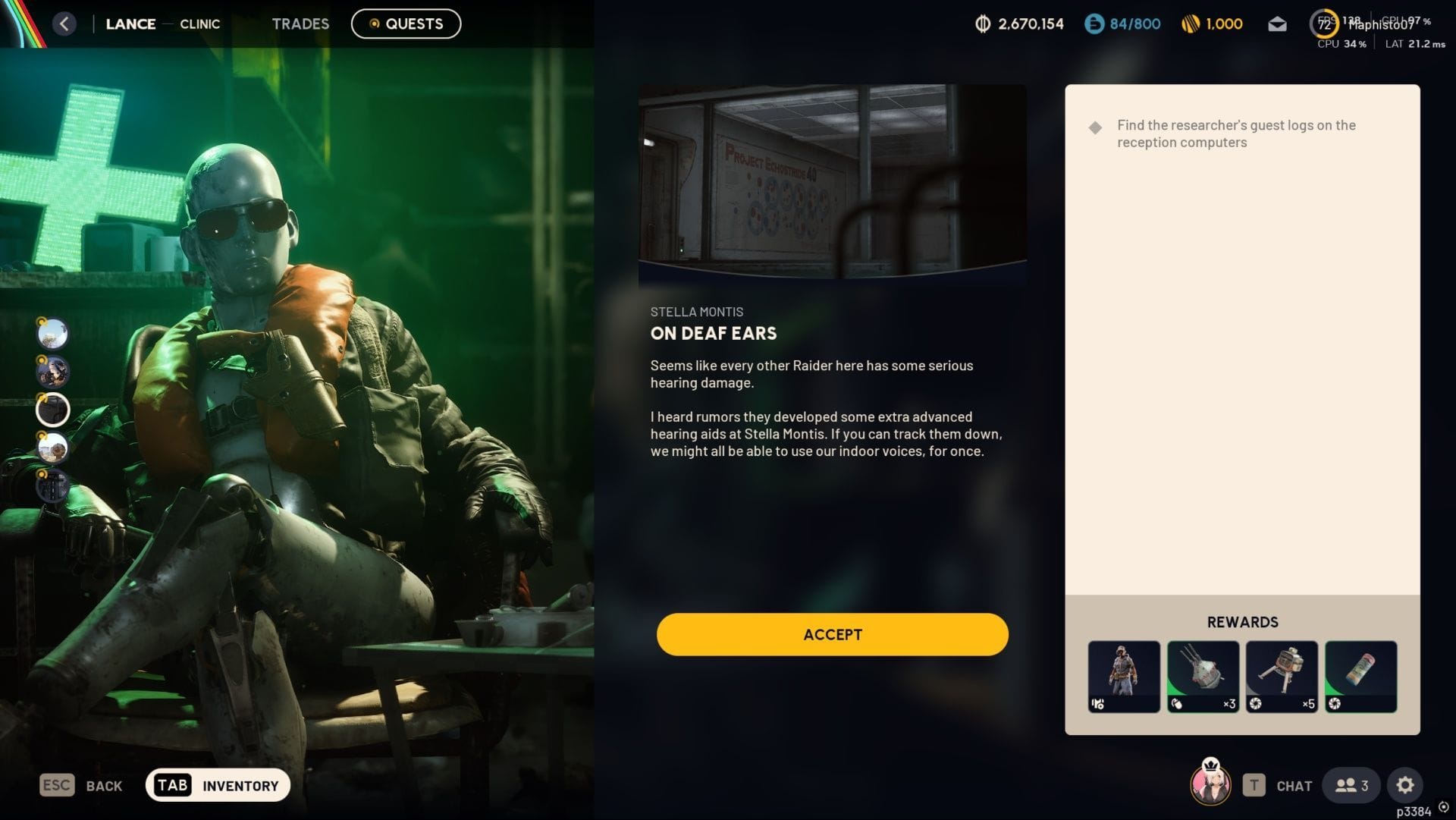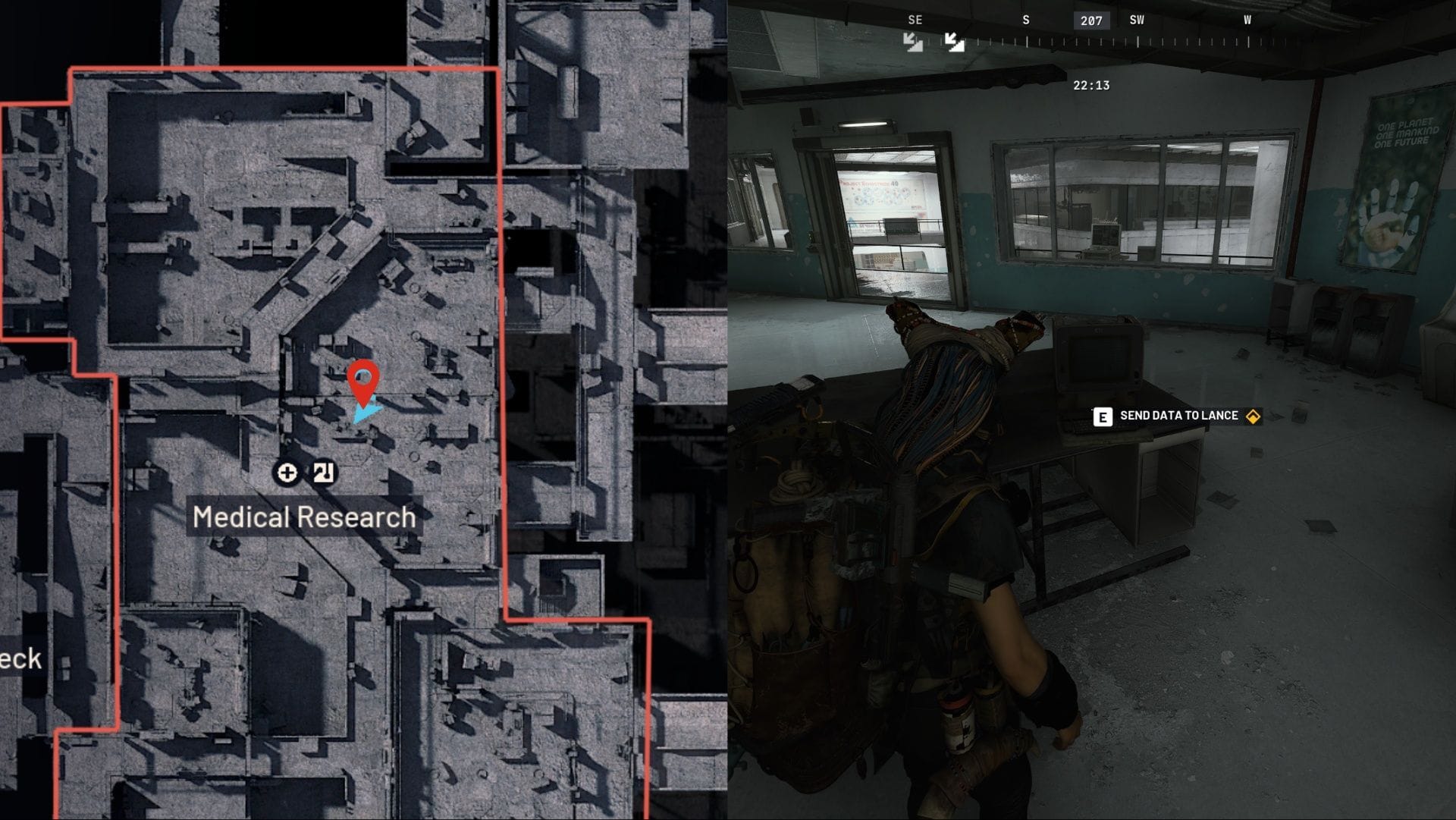 Чтобы выполнить третью задачу, отправьтесь к Медицинским исследованиям. В центральной камере первого уровня платформы вы найдете компьютер. Подойдите к нему, и вы увидите подсказку “Отправить данные Лэнсу.” Взаимодействуйте, чтобы завершить это задание.