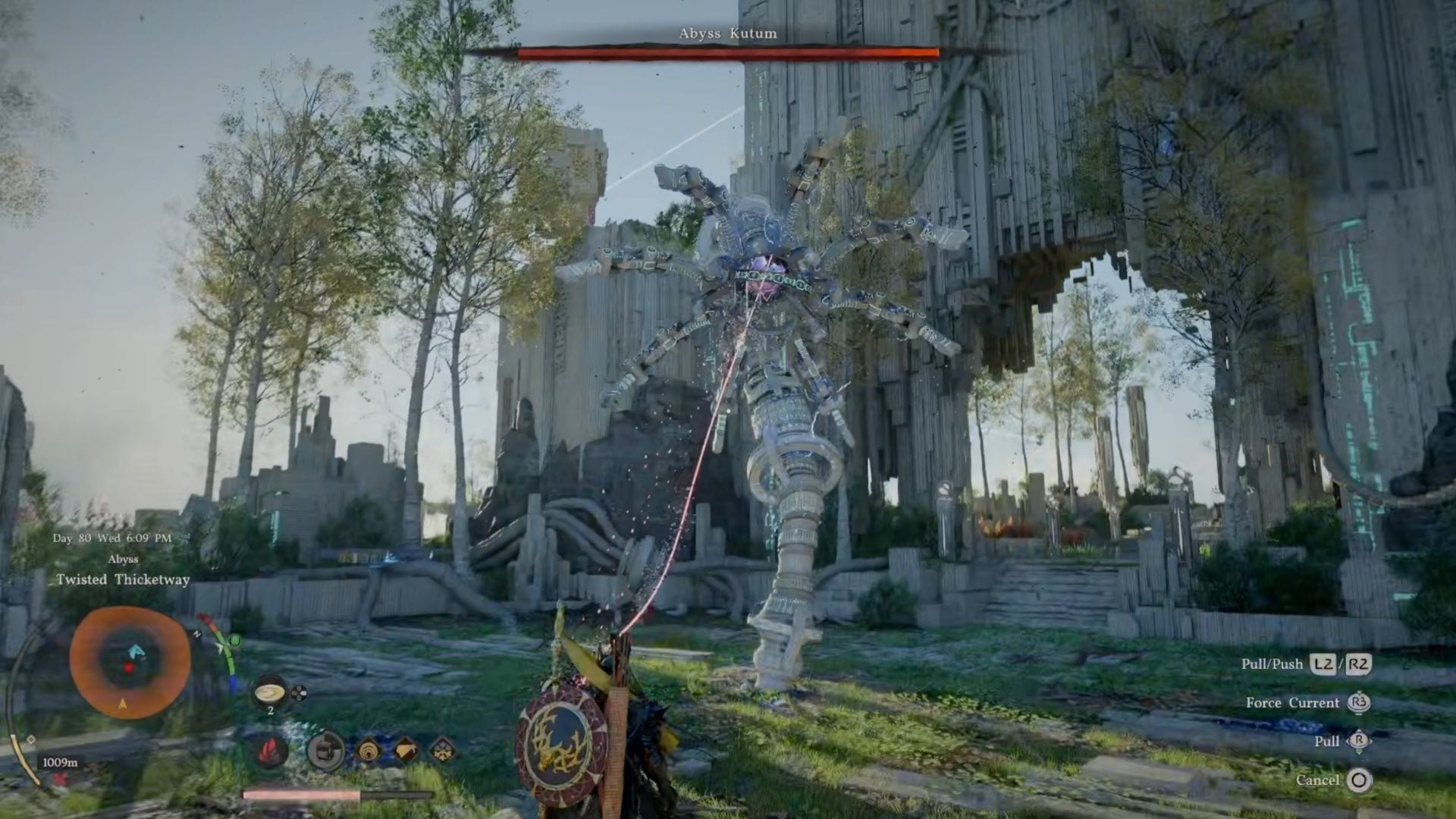 Не забудьте забрать Power Core – Spire of Defiance после победы над этим противником и поместить его в свой Kuku Pot. Затем поднимитесь по стене прямо перед вами, пока не доберетесь до Ворот. Используйте схватку с L2 и активируйте Force Palm, чтобы открыть их. Спуститесь вниз, соберите свой Артефакт Бездны, и на этом все действия, которые можно выполнить в Twisted Thicketway в Crimson Desert.