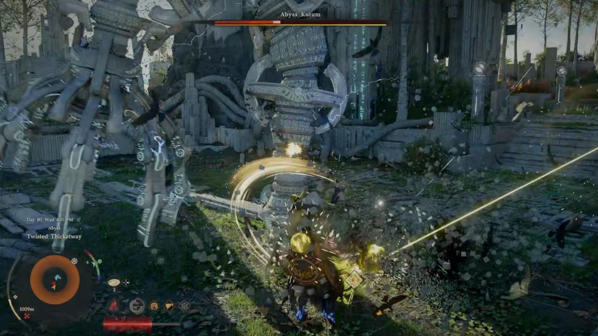 Вам нужно будет победить босса Abyss Kutum, чтобы завершить Т twisted Thicketway в Crimson Desert, но существует хитрый способ его одолеть, если хотите. Если вы хотите более простой способ справиться с этим боссом, срубите одно из деревьев и поднимите его с помощью Nature’s Grasp. Если вы ударите босса, это должно поразить его с одного удара или хотя бы сильно повредить. У этого босса есть несколько атак, на которые стоит обратить внимание: