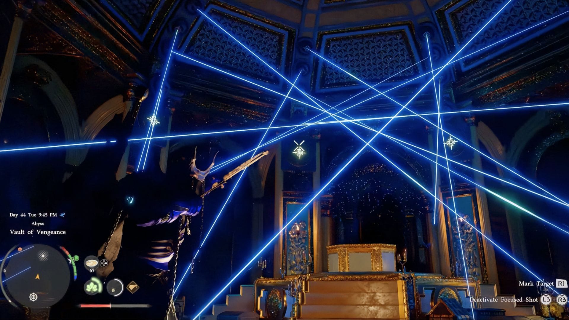 Внутри вы найдете сундук, окруженный лазерами. Снова используйте Фокусированный Шот, чтобы прицелиться в четыре светящихся круга на стене сверху, чтобы отключить охрану. Поднимите Золотой Меч, чтобы активировать лифт, который унесет вас глубже в бездну.