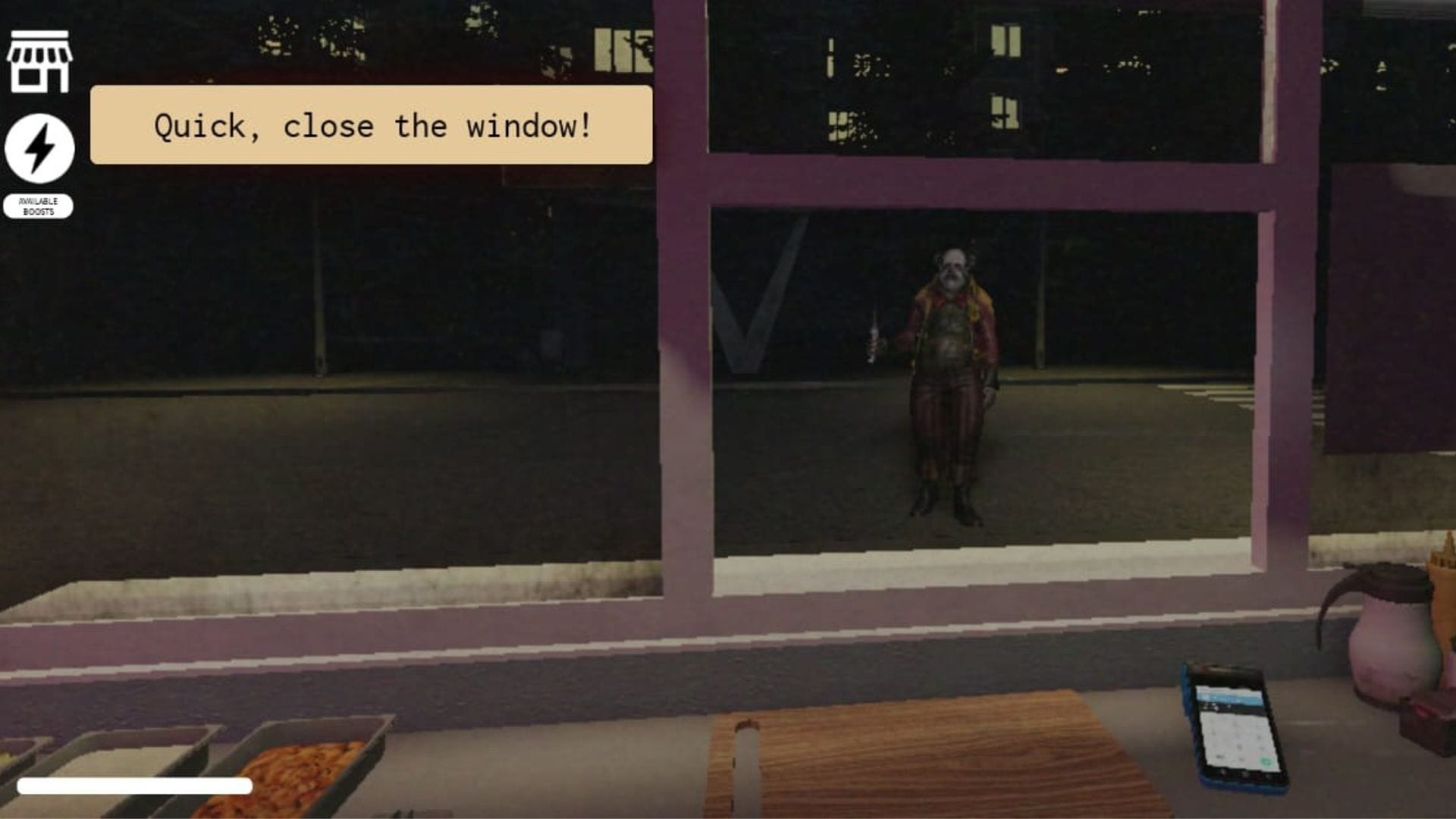 Когда Клоун появляется, уведомление в верхней части экрана сообщает вам о необходимости быстро закрыть шторы. Проблема в том, что шторы не будут работать до самого последнего момента, когда аномалия будет близка к киоску с шаурмой. Попытки убежать от надвигающейся угрозы не принесут результата, так как шутник все равно зайдет в ваше заведение, увеличивая количество ваших ошибок.