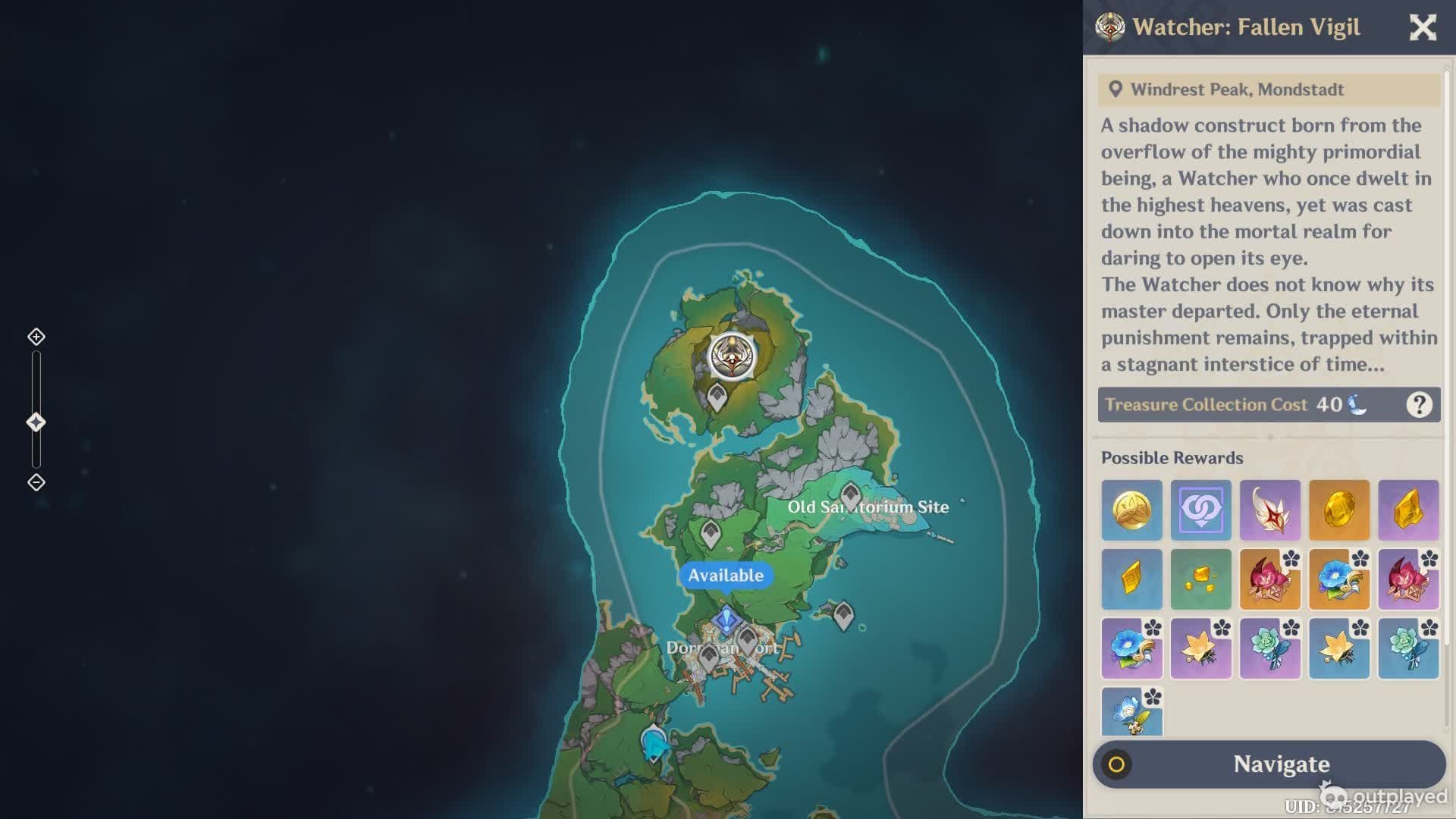Босс Watcher: Fallen Vigil в Genshin Impact был добавлен с обновлением Luna VI. Для его победы вам понадобится получить Plume of the Fallen Watcher, один из множества материалов для ascension Linnea, нового персонажа 5 звёзд. Этот босс расположен в новой зоне порт Дорнман, и вы можете найти его внутри арены на северной границе локации.