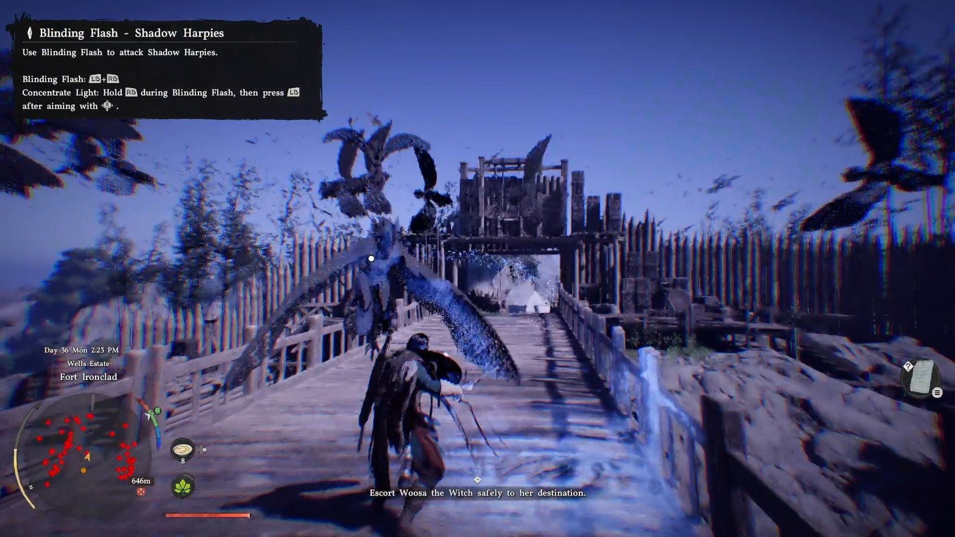 В Crimson Desert вам предстоит сопроводить Woosa the Witch в бамбуковый лес в рамках основного квеста Where the Wind Guides You. Это задание начинается сразу после боя с боссом. Сначала казалось бы, что процесс eskort прост, но ситуация усложняется, когда вы достигаете моста. Стая Shadow Harpies, темных птиц, блокирует ваш путь.