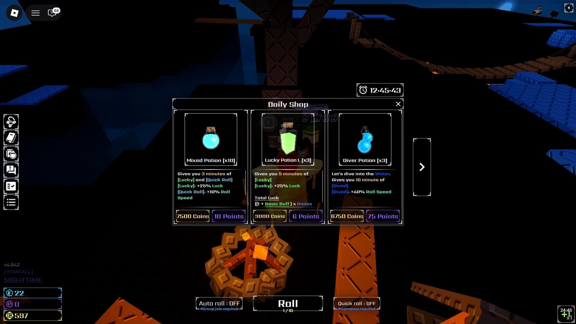 Тёмные Баллы — это основная валюта, используемая для покупки товаров у Фишл и Джестера, двух торговцев, которые появляются в игровом мире. Фишл предлагает разнообразные зелья, которые можно использовать в совокупности с вашими роллами, повышая шансы на получение самых редких Аур в игре. Игроки на поздних стадиях могут значительно выиграть, получив доступ к этому торговцу.