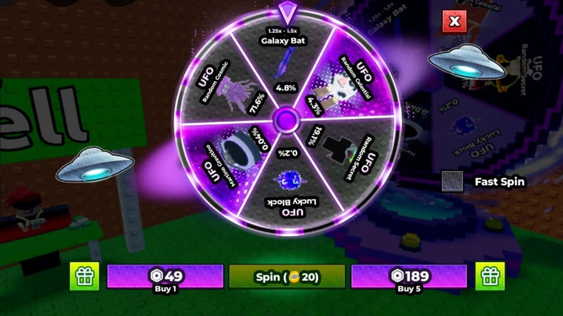 Крутящийся колесо расположено рядом с магазином Продаж в безопасной зоне. Чтобы сделать вращение, вам понадобятся UFO Spins, которые можно получить за Robux или UFO Coins. Последние — это валюта, доступная во время события UFO, когда на карте появляется черная дыра, позволяющая вам создавать brainrots для получения UFO Coins.